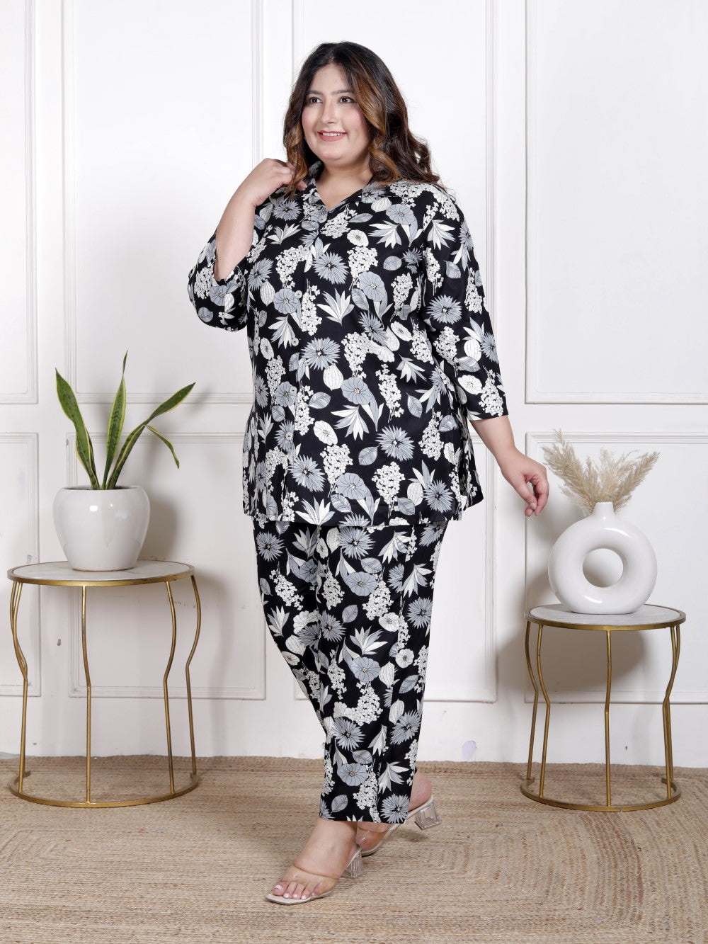 Plus Size Black Floral Print Co-ord Set – 1200037-Black