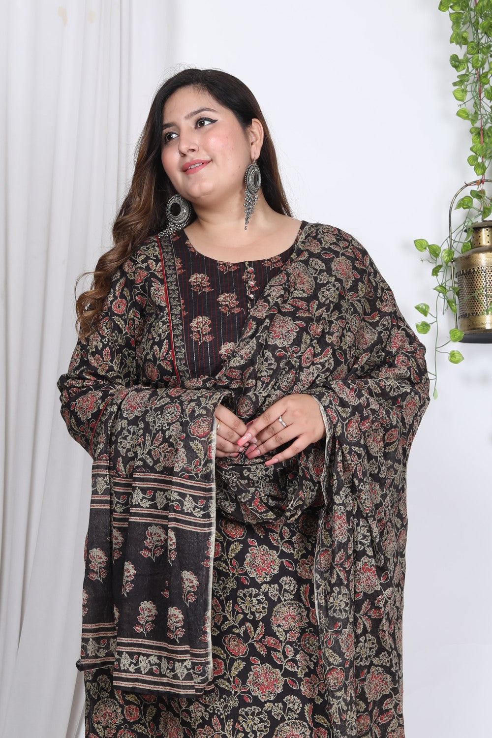 Plus Size Black Cotton Floral Print Kurta Pant Set with Dupatta
