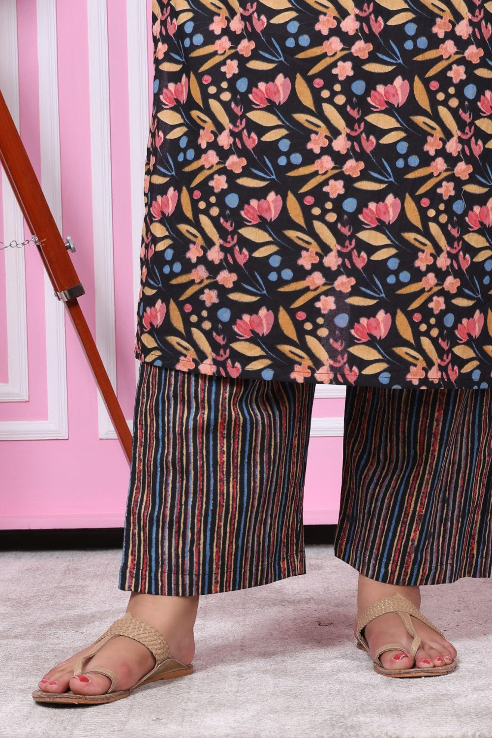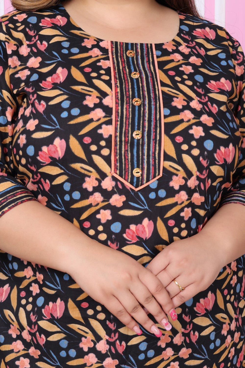 Upgrade your wardrobe with the Plus Size Black Cotton Printed Kurta Pant Set with Dupatta, and experience the perfect combination of comfort and elegance for every occasion.