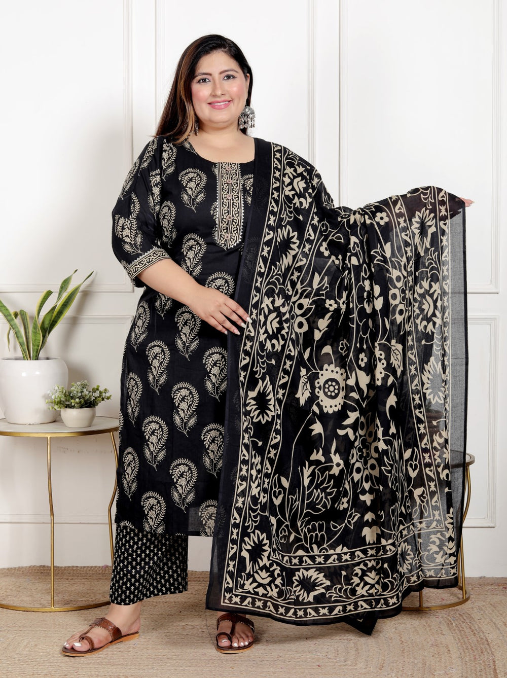 Plus Size Black Cotton Printed Kurta Pant Set with Dupatta