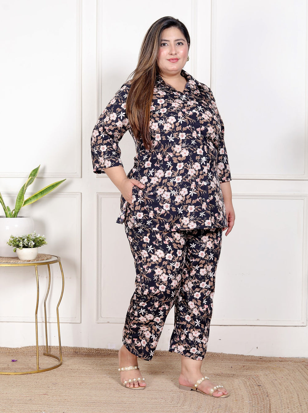 Stay effortlessly chic in this floral print crepe co-ord set, crafted from soft, flowy crepe fabric known for its smooth texture and graceful fall. Designed for plus-size comfort, it offers a flattering fit with easy movement. Perfect for all seasons, the breathable fabric keeps you cool — and can be stylishly layered for winter too.