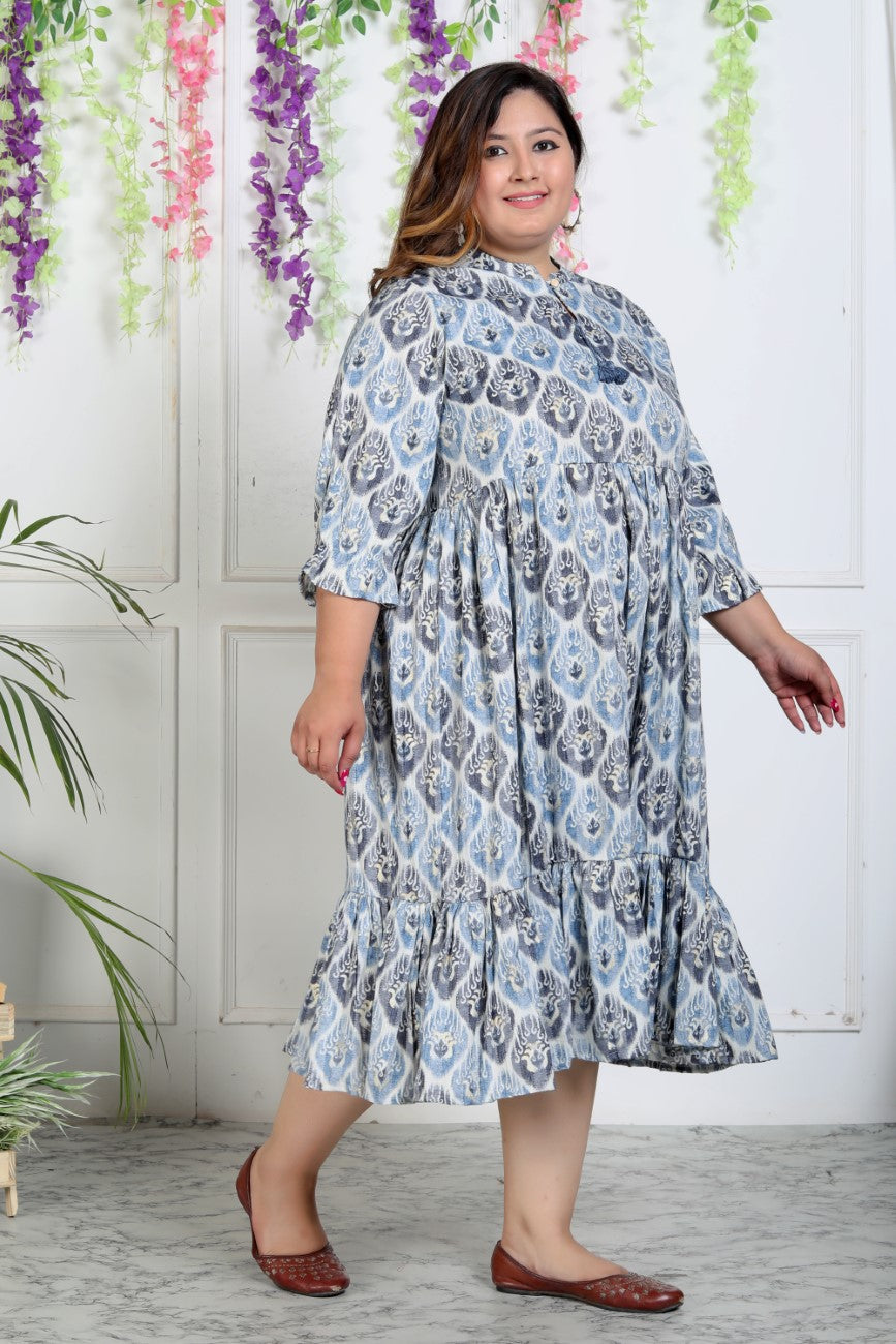 Embrace your love for blue with this exquisite Plus Size Blue Cotton Blend Printed Midi Dress. This chic frock style midi dress features a stunning printed pattern on soft, breathable cotton blend fabric that brings both elegance and comfort to your wardrobe. The calf-length design beautifully complements the plus-size body type, while the flowing silhouette adds an extra touch of grace. Whether you're attending a wedding or a festive celebration, or simply want to look effortlessly chic on a night out, this dress has you covered.
