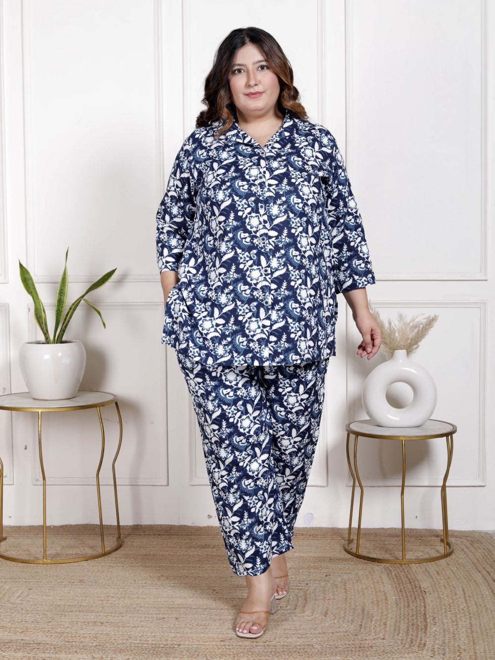 Bring a touch of freshness and flair to your wardrobe with this Plus Size Blue Floral Print Co-ord Set. Perfect for both casual outings and festive occasions, this stylish set features a lively floral print on a cool blue base that adds an effortless chic vibe. The breathable cotton fabric ensures comfort, while the collared neck and 3/4 sleeves give it a sophisticated yet laid-back look. Plus, the set comes with convenient pockets for added practicality!
