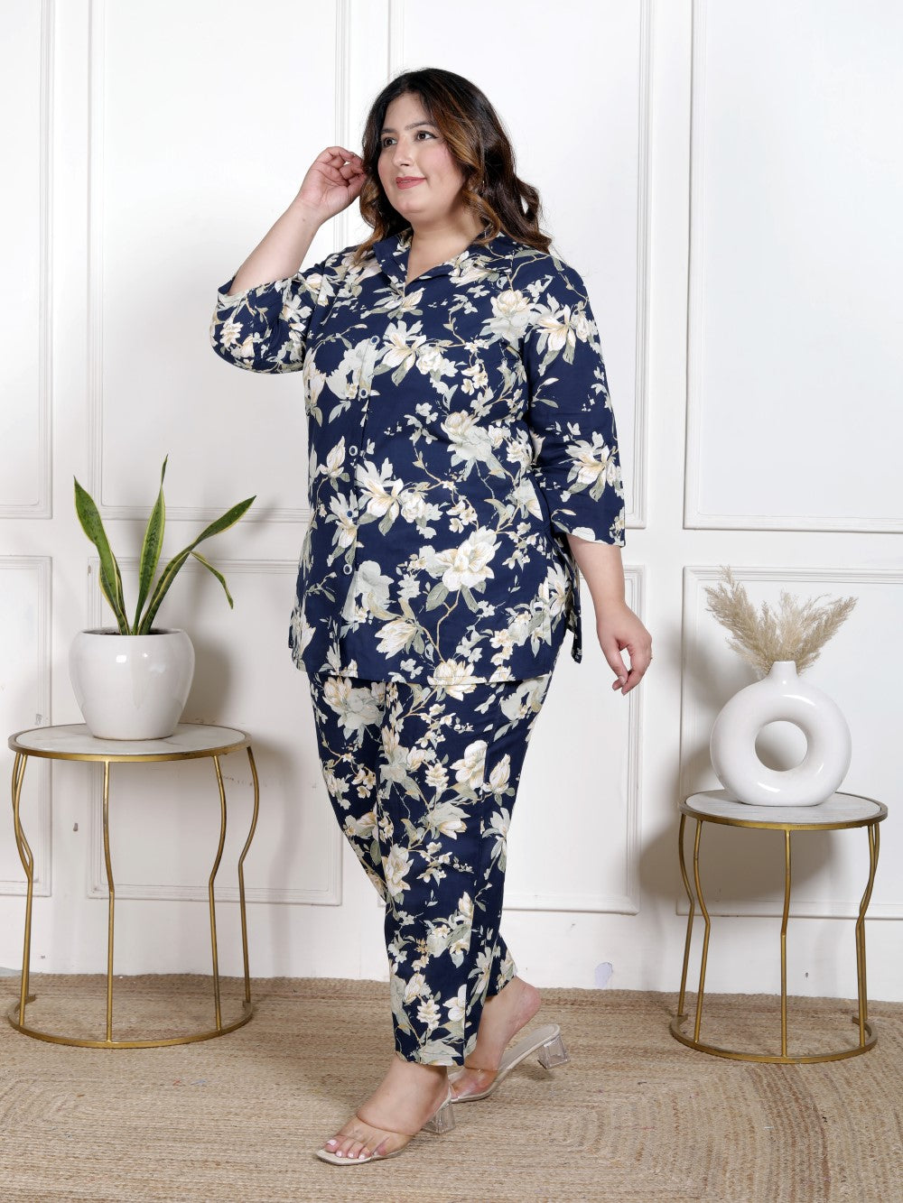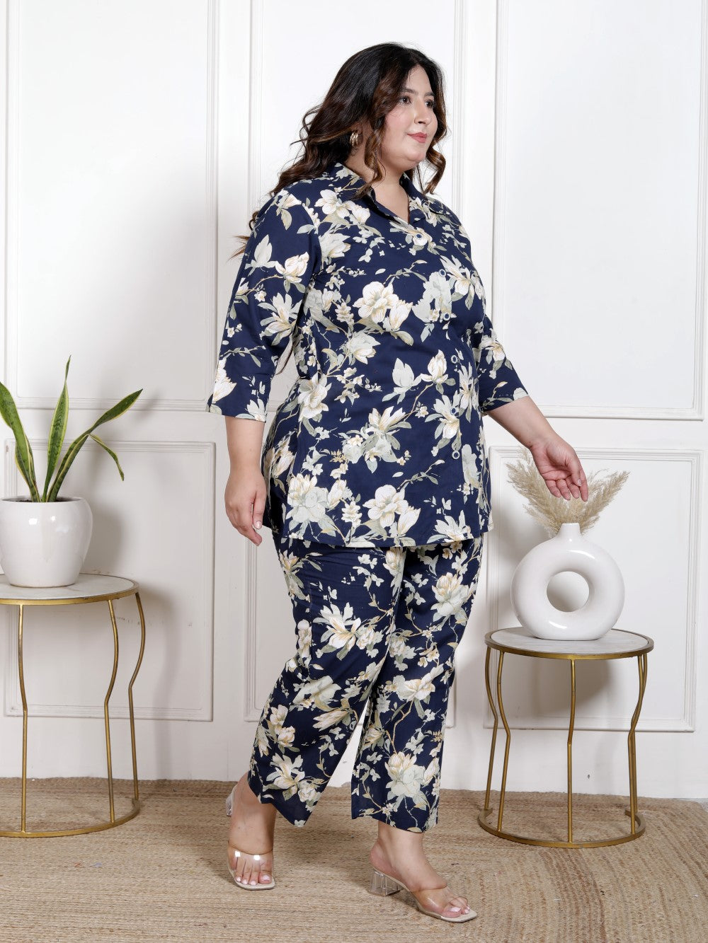 Bring a touch of freshness and flair to your wardrobe with this Plus Size Blue Floral Print Co-ord Set. Perfect for both casual outings and festive occasions, this stylish set features a lively floral print on a cool blue base that adds an effortless chic vibe. The breathable cotton fabric ensures comfort, while the collared neck and 3/4 sleeves give it a sophisticated yet laid-back look. Plus, the set comes with convenient pockets for added practicality!