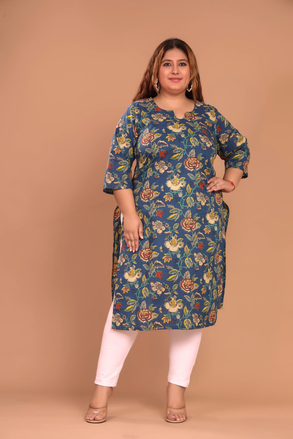 Refresh your casual collection with the Plus Size Blue Cotton Floral Print Straight Kurta, a perfect blend of elegance and comfort. Made from 100% pure cotton, this kurta is lightweight, breathable, and ideal for all-day wear. The rich blue hue is beautifully enhanced with a vibrant floral print, making it a charming and versatile wardrobe essential.