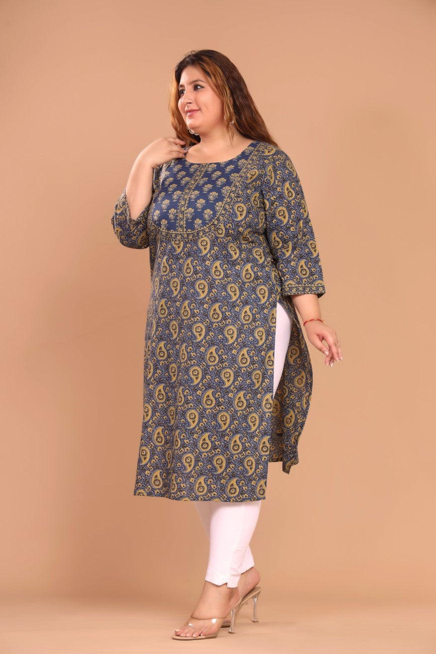 Refresh your casual collection with the Plus Size Blue Cotton Floral Print Straight Kurta, a perfect blend of elegance and comfort. Made from 100% pure cotton, this kurta is lightweight, breathable, and ideal for all-day wear. The rich blue hue is beautifully enhanced with a vibrant floral print, making it a charming and versatile wardrobe essential.