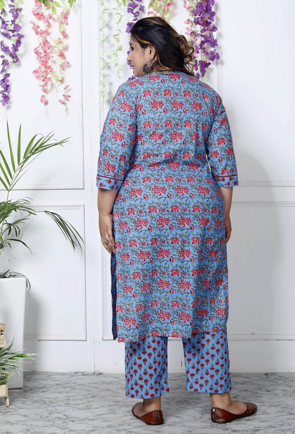 This Plus Size Blue Cotton Printed Kurta Pant Set with Dupatta is the perfect addition to your wardrobe. The floral print and flattering fit will have you looking chic and feeling comfortable at the same time. Whether you're heading to a casual outing or a festive gathering, this set ensures you're dressed to impress.