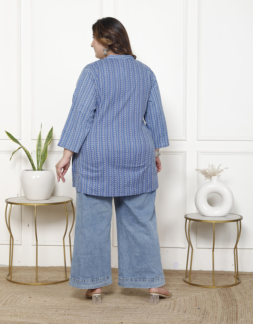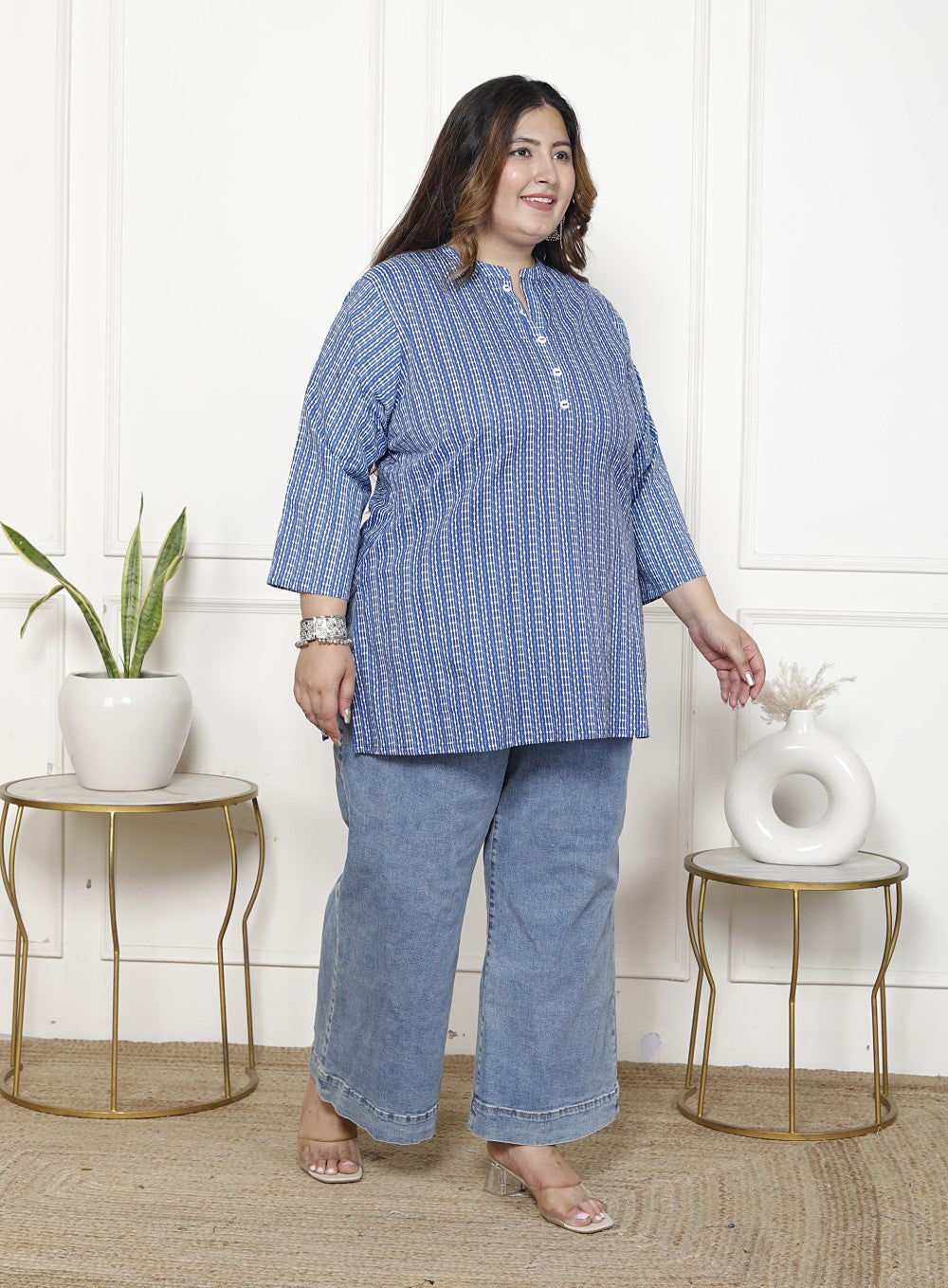 Elevate your wardrobe with the Plus Size Blue Cotton Printed Short Kurta. This beautifully crafted kurta is made from pure cotton, ensuring maximum comfort and breathability for all-day wear. The Mandarin collar adds a sophisticated touch, while the regular sleeves with a 3/4 sleeve length provide a relaxed and stylish look.