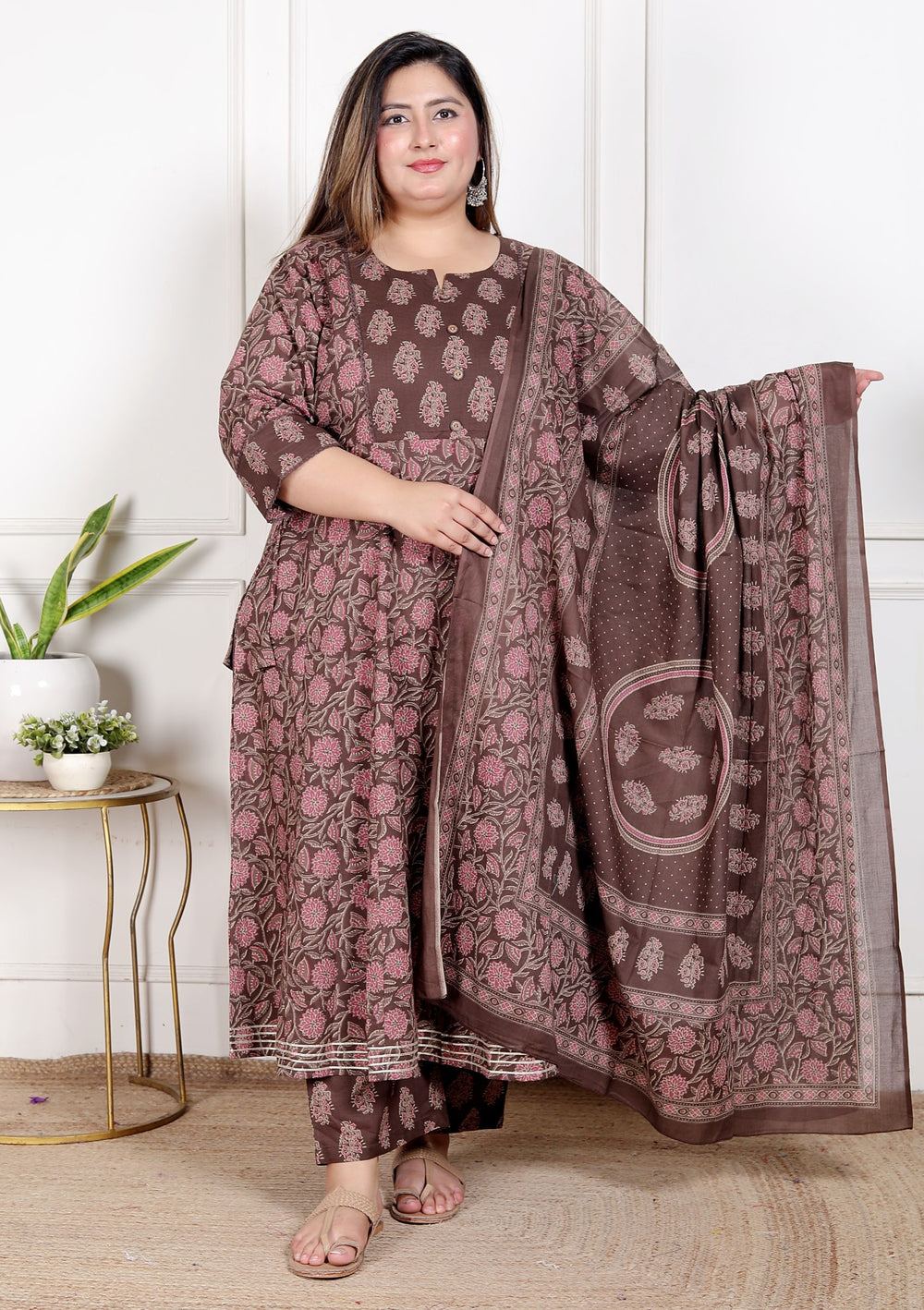 Plus Size Brown Anarkali Cotton Printed Flared Kurta Pant Set with Dupatta-210009