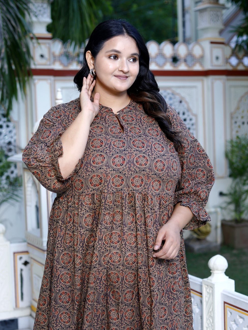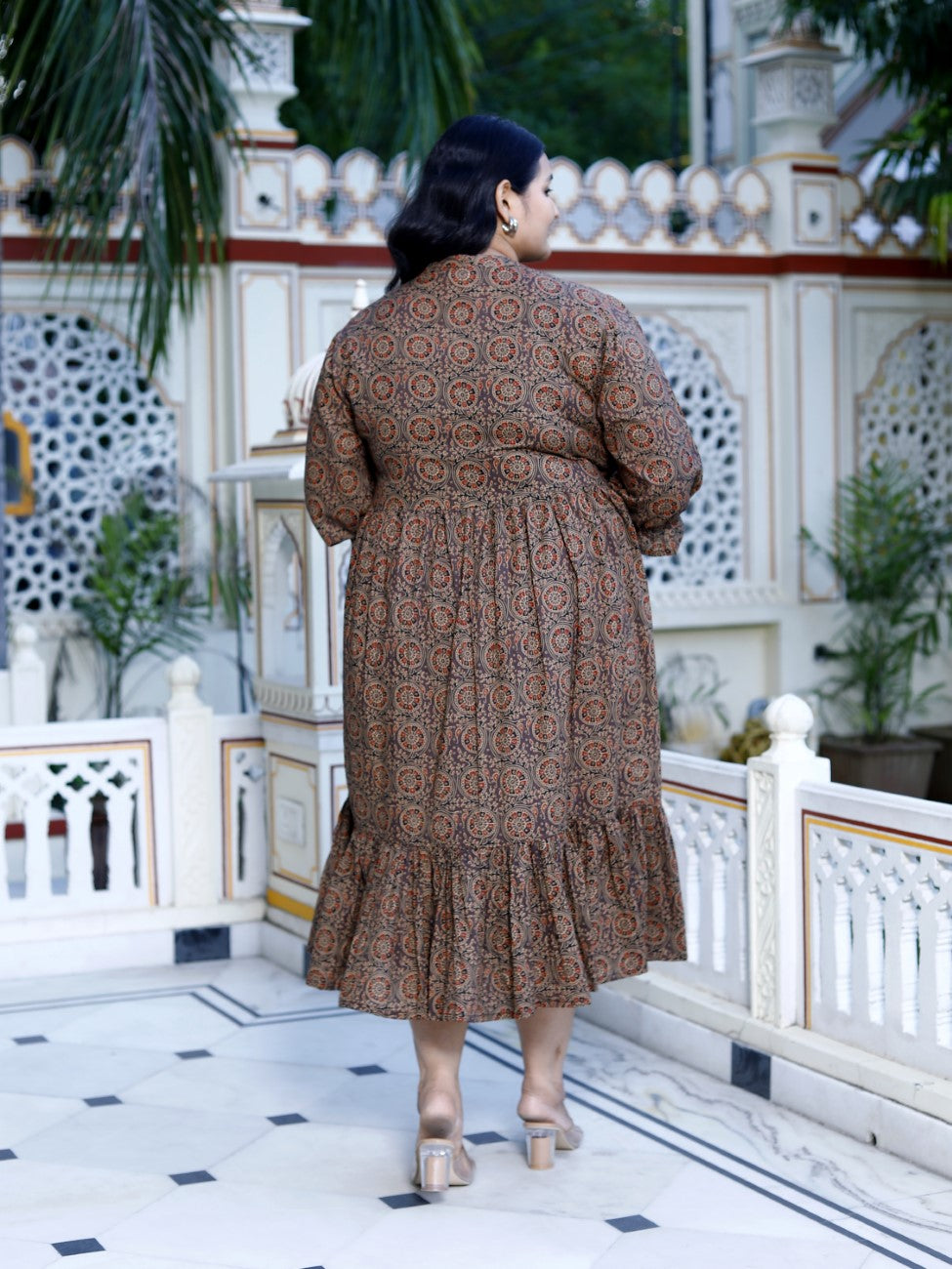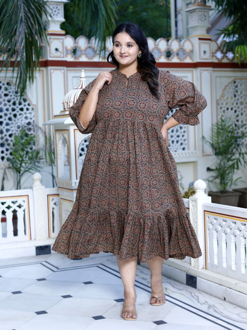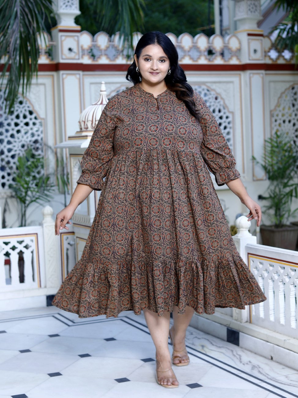Ace your favourite Browncolour in this amazing Frock Style. This stunning Midi Dress features intricate Brown Cotton  fabric that exudes elegance and sophistication. The Calf-length design flatters plus-size body type, and the flowing style adds an extra touch of grace. Whether you're attending a wedding or a party, or simply want to look chic on a night out, this Frock Style A-Line has got you covered. So why wait? Add the Plus Size Brown Cotton  to your collection today and get ready to make a statement wherever you go. go.