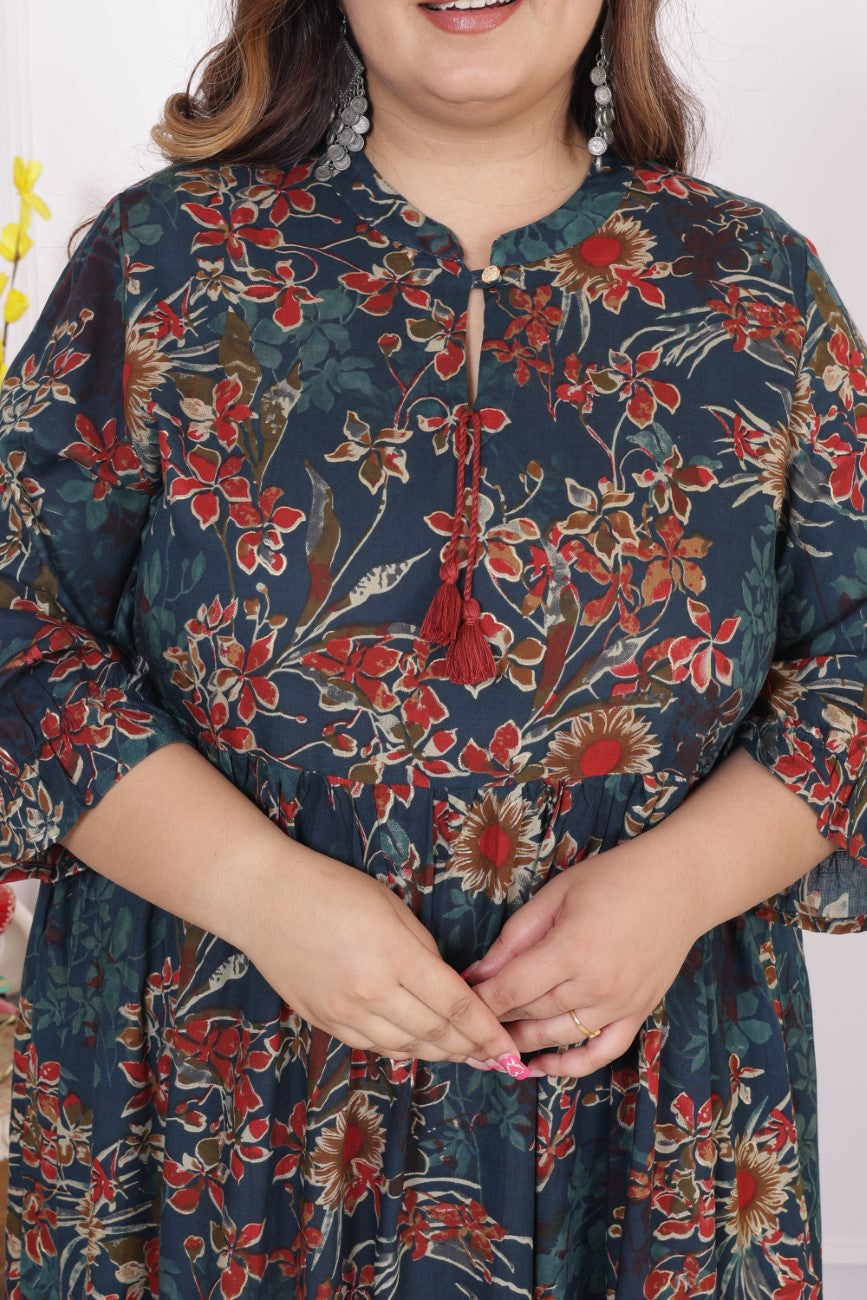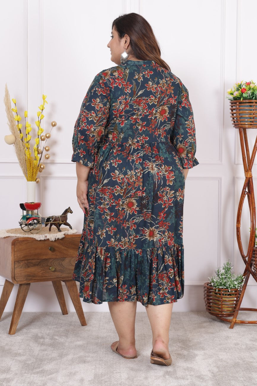 Step into a world of elegance with this beautiful Plus Size Green Cotton Blend Printed Midi Dress. Designed with intricate prints and crafted from soft, breathable cotton blend fabric, this frock-style midi dress offers both comfort and sophistication. The calf-length design perfectly flatters the plus-size body, and the flowing A-line silhouette adds a graceful touch to your movements. Whether you're attending a wedding, a festive gathering, or simply want to add a chic flair to your casual night out, this dress ensures you're ready for any event.