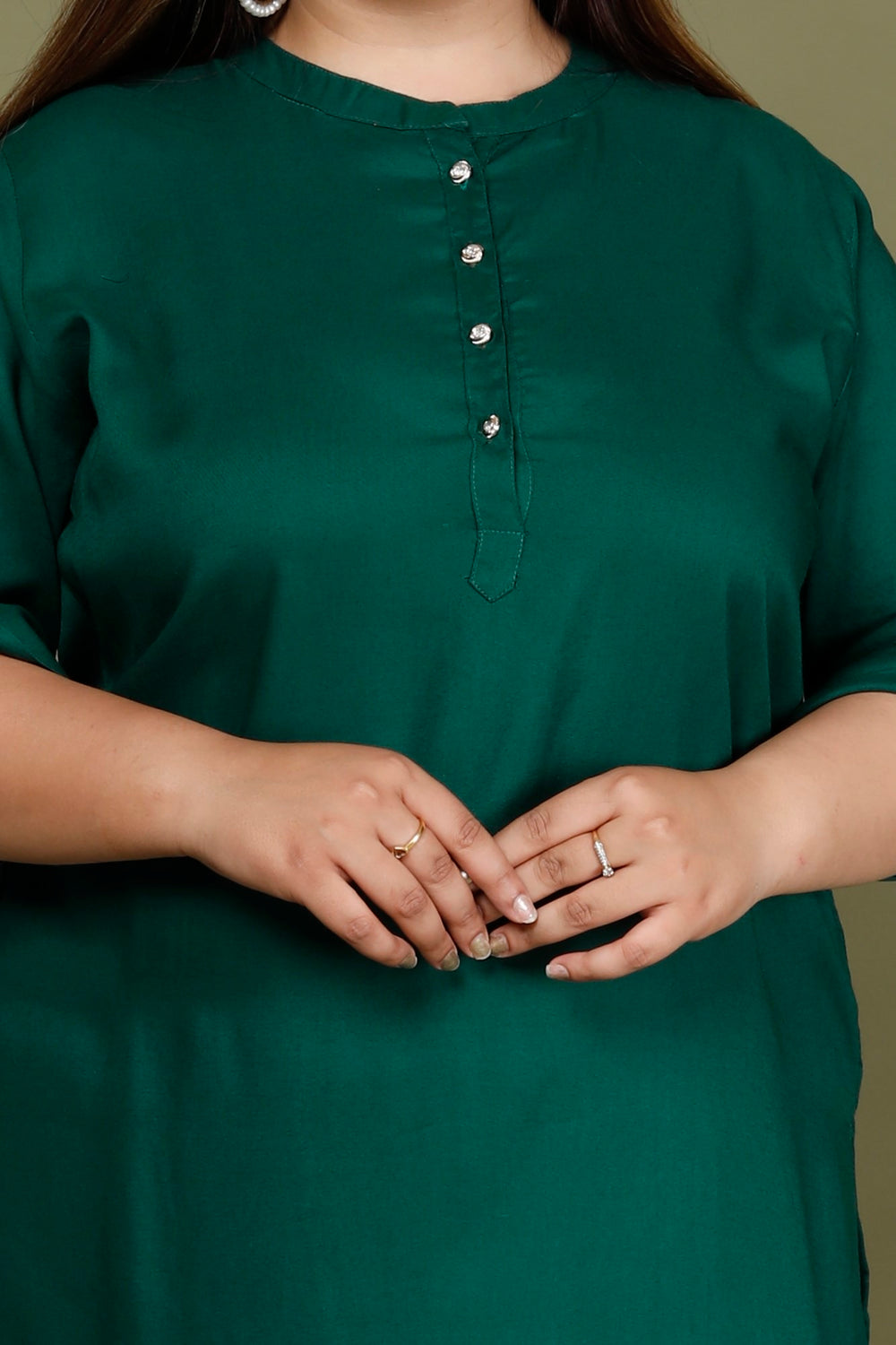 Upgrade your wardrobe with the Plus Size Green Cotton Blend Straight Kurta, a stylish and versatile piece designed for ultimate comfort. Made from a soft cotton blend, this kurta ensures breathability and ease of movement throughout the day. The solid green hue adds a touch of sophistication, while the Mandarin collar and 3/4 sleeves create a polished yet relaxed look. The calf-length straight cut with side slits enhances mobility, making it perfect for casual outings, work, or everyday wear.
