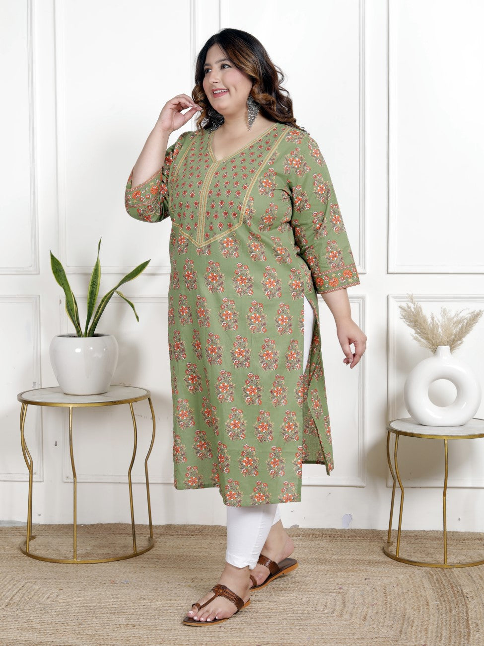 Plus Size Green Cotton Floral Print Straight Kurta – 100049-Green