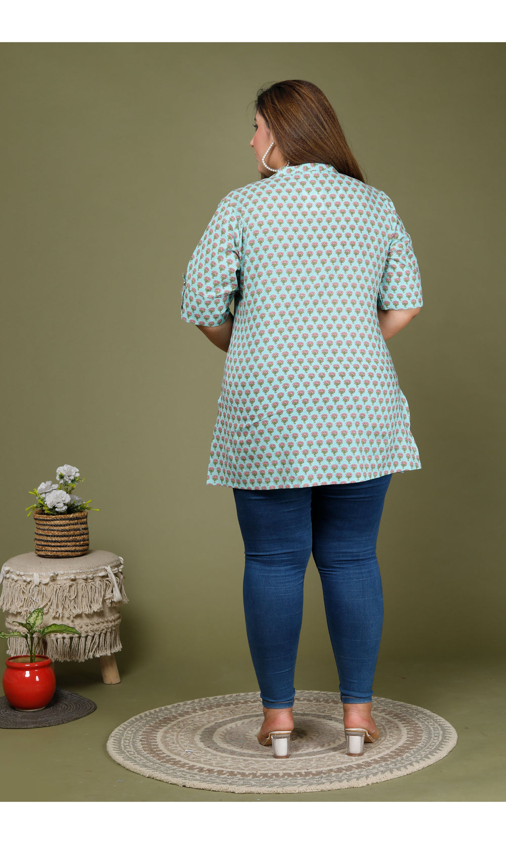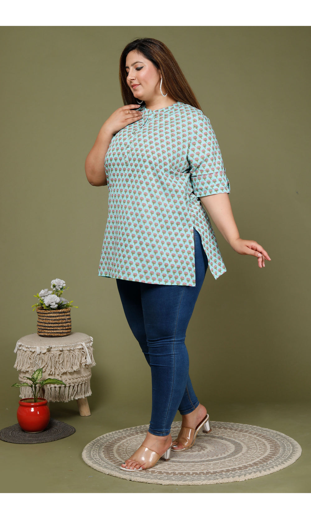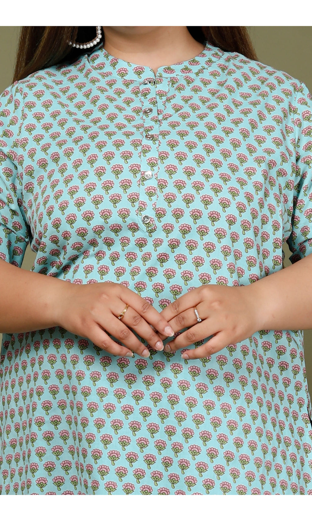 Plus Size Blue Cotton Floral Print Short Kurta-653