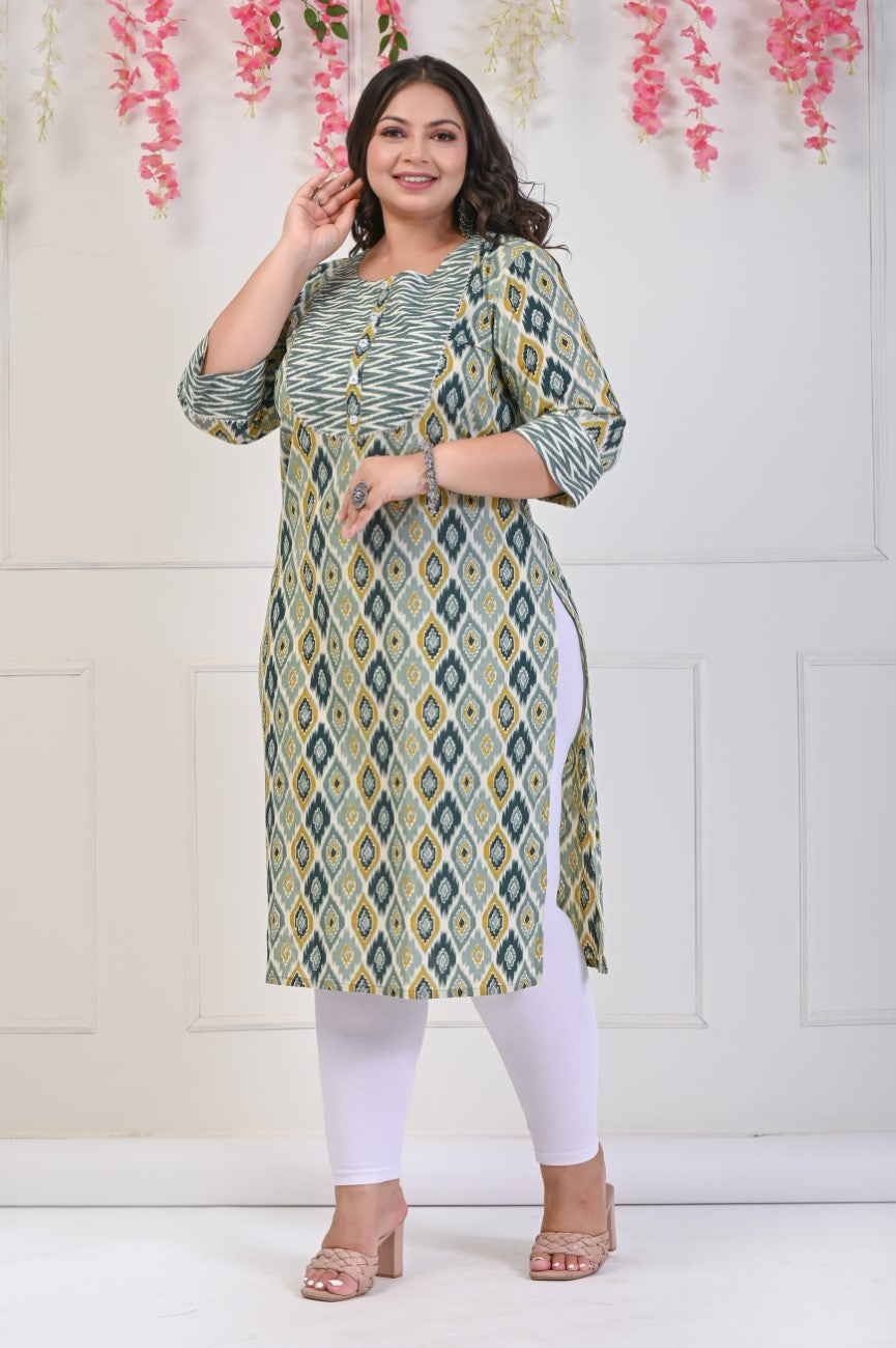 Discover our plus size Green cotton printed straight kurta. Made from pure cotton, this calf-length kurta promises ultimate comfort while keeping you stylish. The grey colour with a printed pattern adds a touch of elegance to your look. The straight style with side slits ensures a flattering fit for all body types. The round neck design offers a classic touch to the overall style. This kurta is perfect for any casual occasion and can be paired with leggings or jeans for a complete look. Upgrade your wardrobe with the Plus Size Grey Cotton Print Straight Kurta and experience the perfect of style and comfort.