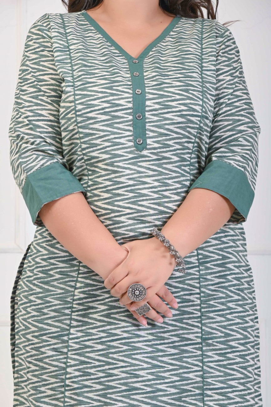 Refresh your ethnic wardrobe with this Plus Size Green Cotton Printed Straight Kurta, designed to offer both elegance and comfort. Crafted from high-quality pure cotton, this kurta ensures breathability and ease for all-day wear. The straight-cut silhouette with side slits provides a flattering fit, while the intricate printed design adds a touch of sophistication. Featuring a V-neckline and 3/4 sleeves, this kurta is perfect for casual outings, work, or special occasions.