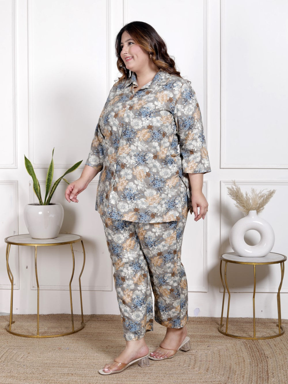 Plus Size Grey Cotton Blend Floral Print Co-ord Set -1200036