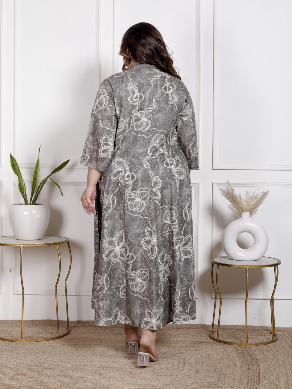 Plus Size Grey Cotton Blend Goldn Print Aline Kurta-4100058