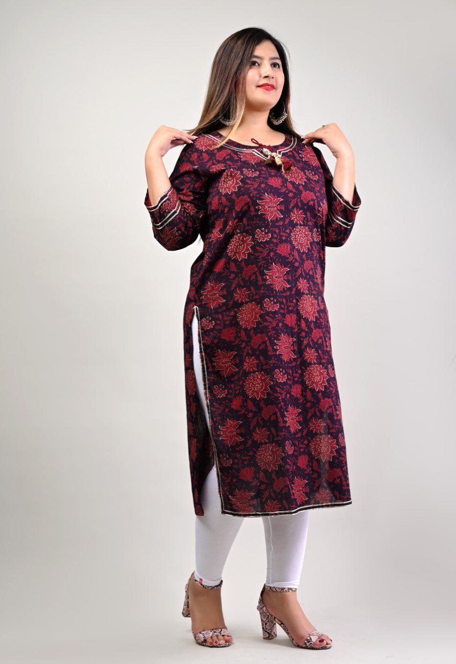 Elevate your wardrobe with the Plus Size Maroon Cotton Floral Print Straight Kurta – a perfect blend of timeless style and effortless comfort. Crafted from high-quality cotton fabric, this kurta is ideal for all-day wear, offering a chic yet relaxed fit that’s flattering for plus-size women.