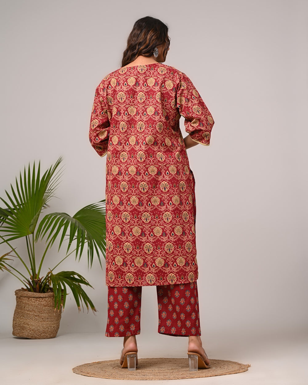 The Maroon Cotton Printed Kurta Pant Set with Dupatta is the perfect blend of elegance and comfort. Whether you're dressing up for a festive celebration or enjoying a casual day out, this set will ensure you stand out with its rich color and flattering design. The breathable cotton fabric keeps you cool, while the floral print adds a feminine and fashionable element.