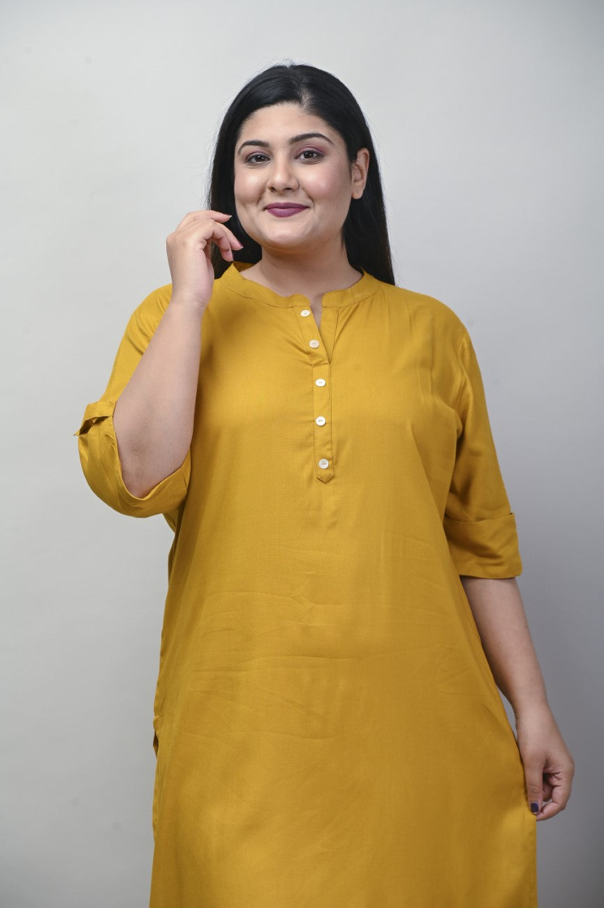 The Plus Size Mustard Cotton Blend Straight Kurta is perfect for any casual occasion. This calf-length kurta features a solid mustard color and a mandarin collar for a stylish and sophisticated touch. The cotton blend fabric ensures comfort and breathability, while the side slits and 3/4 sleeves add a touch of elegance. This kurta does not come with pockets and is designed in a straight cut. Hand wash and dry in shade to ensure the longevity of the fabric. The package includes one kurta in a beautiful mustard color.