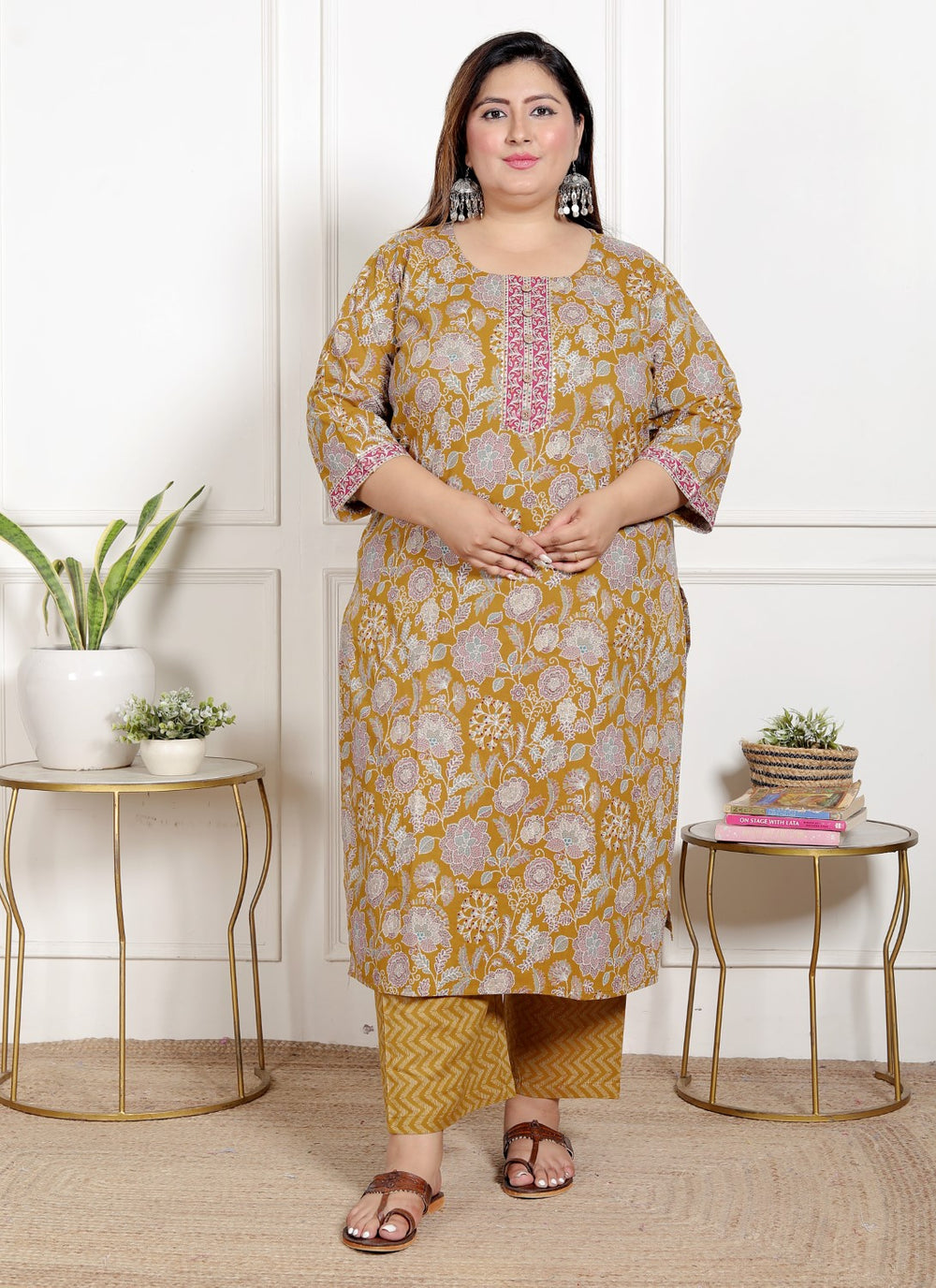 Add a splash of sunshine to your wardrobe with the Plus Size Mustard Cotton Printed Kurta Pant Set with Dupatta. This charming set is ideal for both casual and festive occasions, designed to keep you comfortable while ensuring you look chic and stylish.