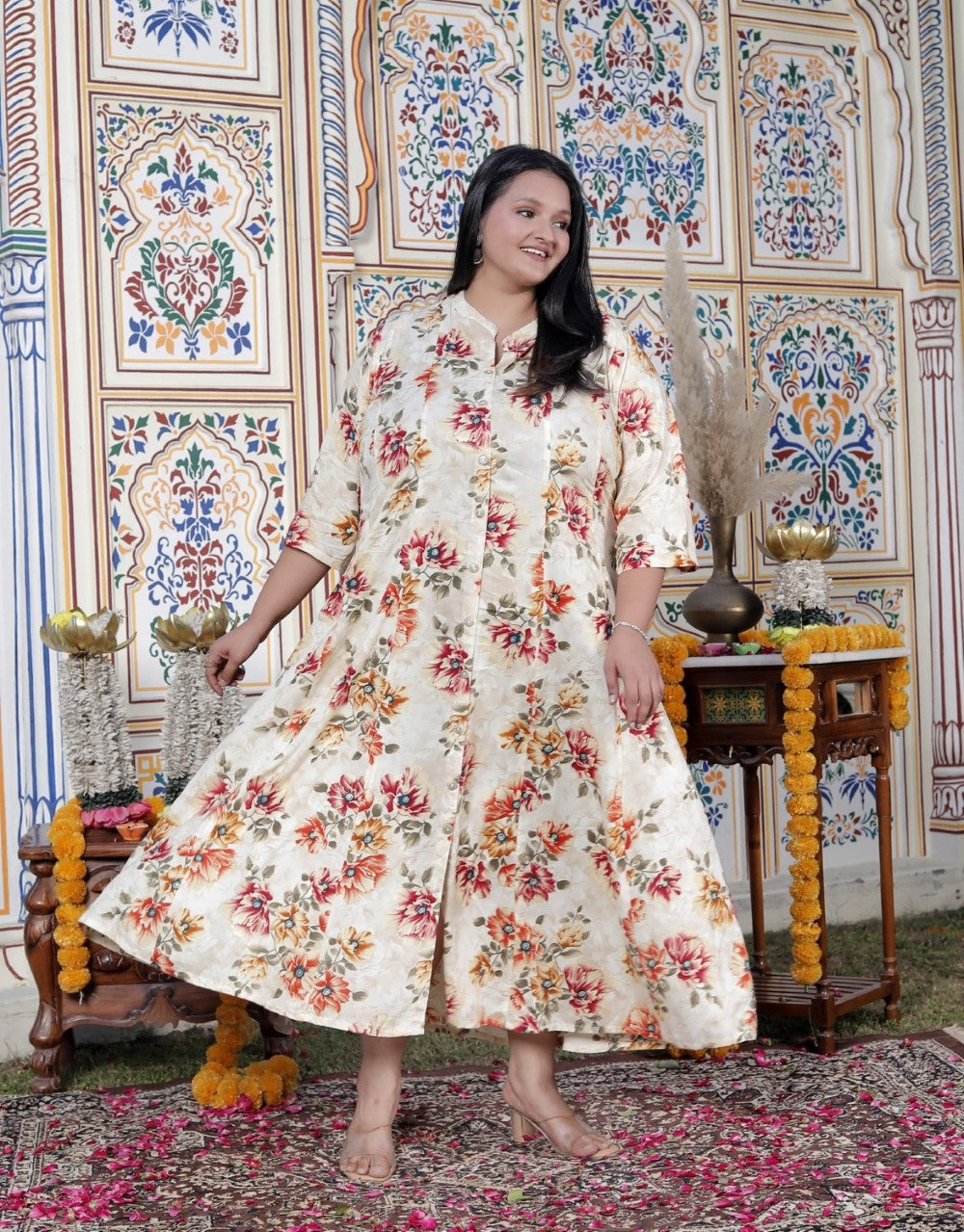 Featuring a Mandarin collar, front slits, and 3/4 sleeves, this Aline kurta is designed to flatter plus-sized frames while keeping you cool and chic. The pocket-free design ensures a sleek silhouette, making it a versatile piece for various occasions.