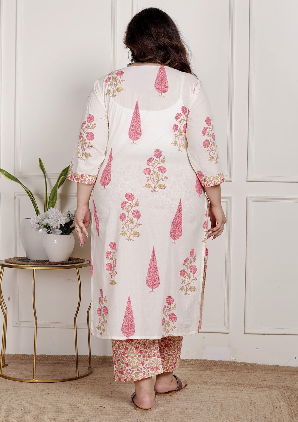 Plus Size Off White Cotton Printed Kurta Pant Set with Dupatta