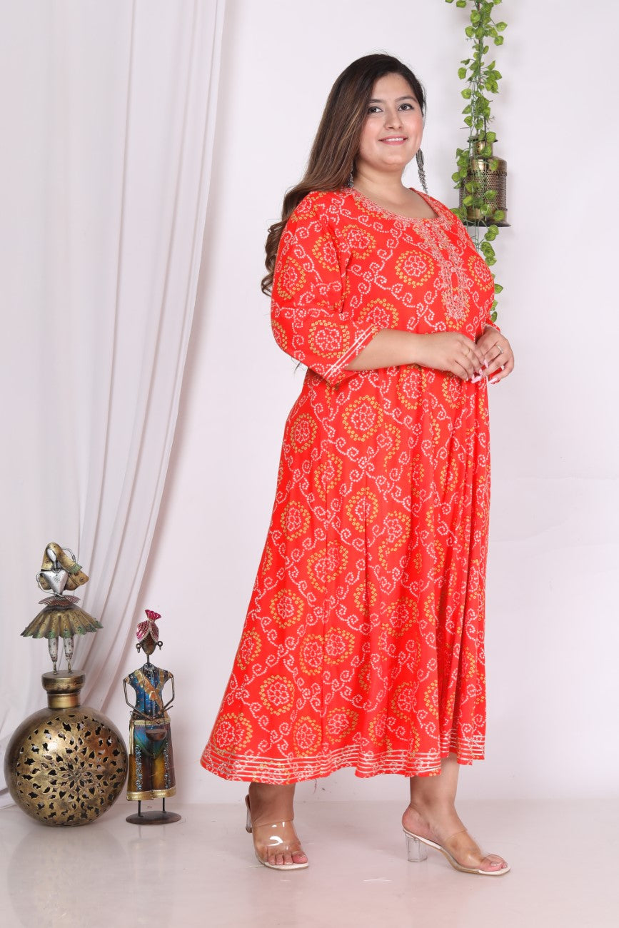 Plus Size Orange Bandhani Print Embroidered Anarkali Gown