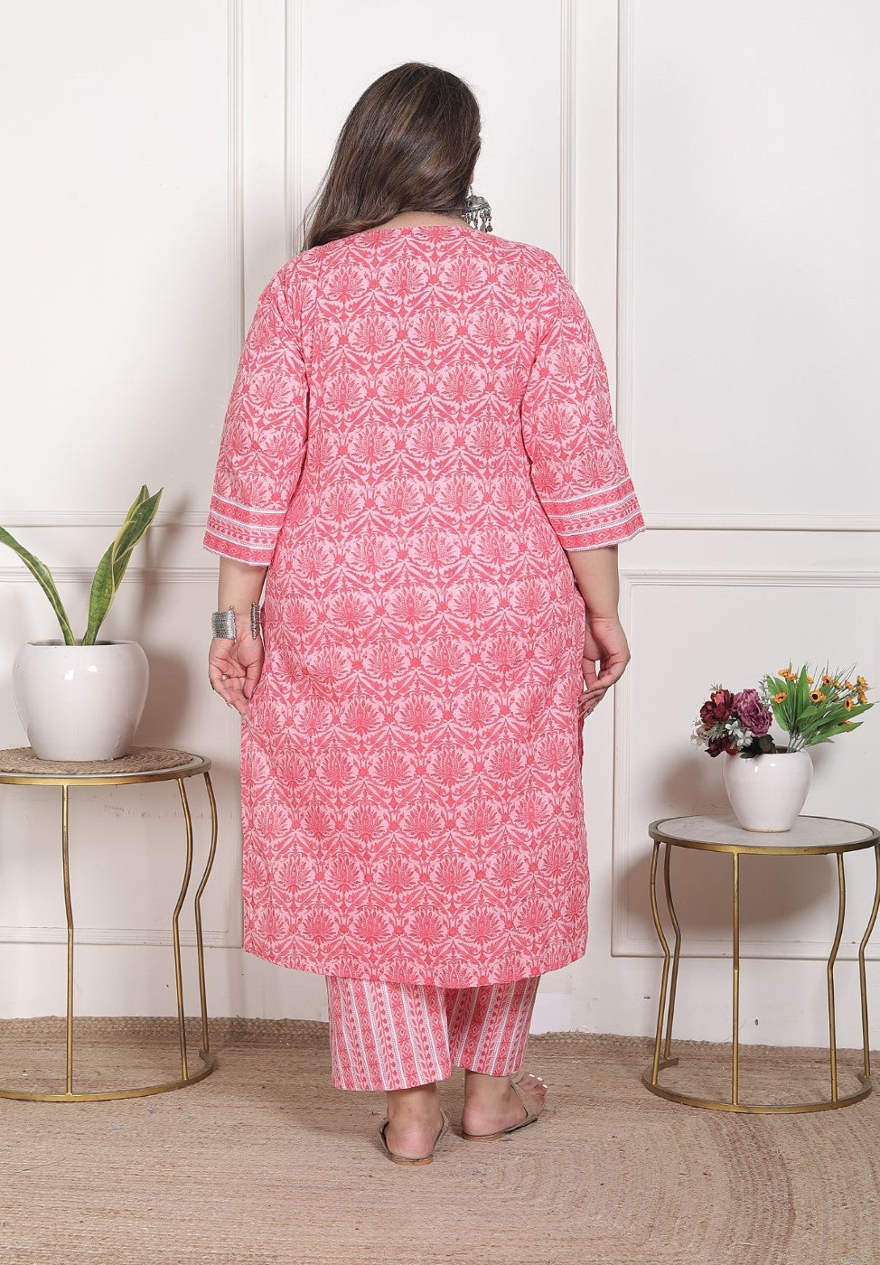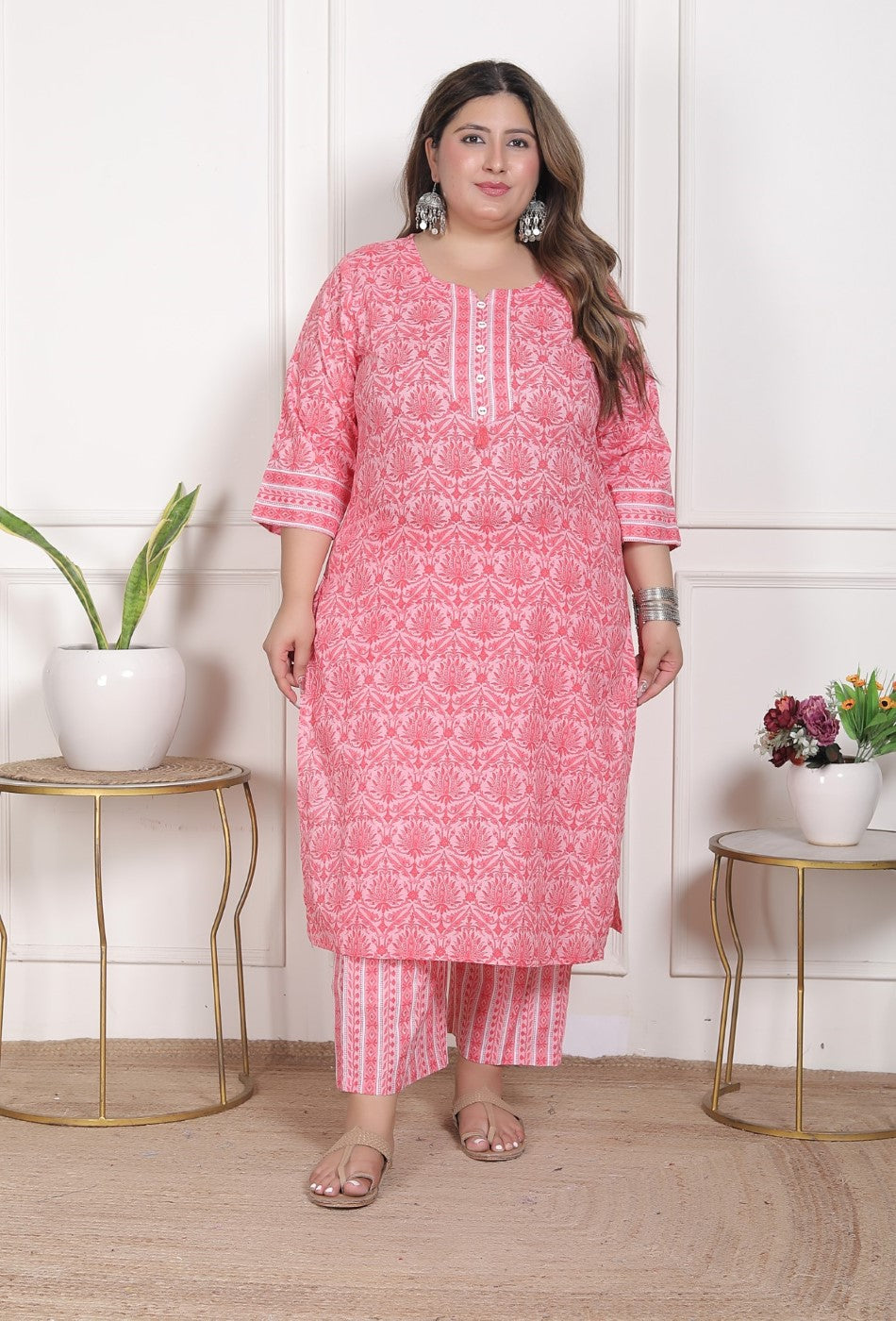 Plus Size Peach Cotton Printed Kurta Pant Set with Dupatta