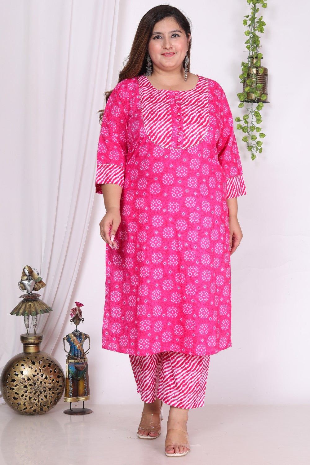 Plus Size Pink Cotton Bandhani Kurta Pant Set with Dupatta