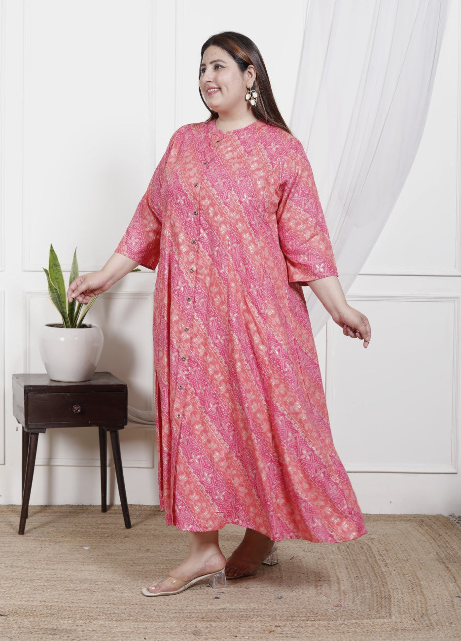 Add a touch of elegance and flair to your style with the Plus Size Pink Cotton Blend Golden Print Aline Kurta. This calf-length kurta in a beautiful pink hue features an eye-catching golden print pattern, making it a statement piece for any occasion. Made from a soft and breathable cotton blend fabric, this kurta offers both comfort and style.
