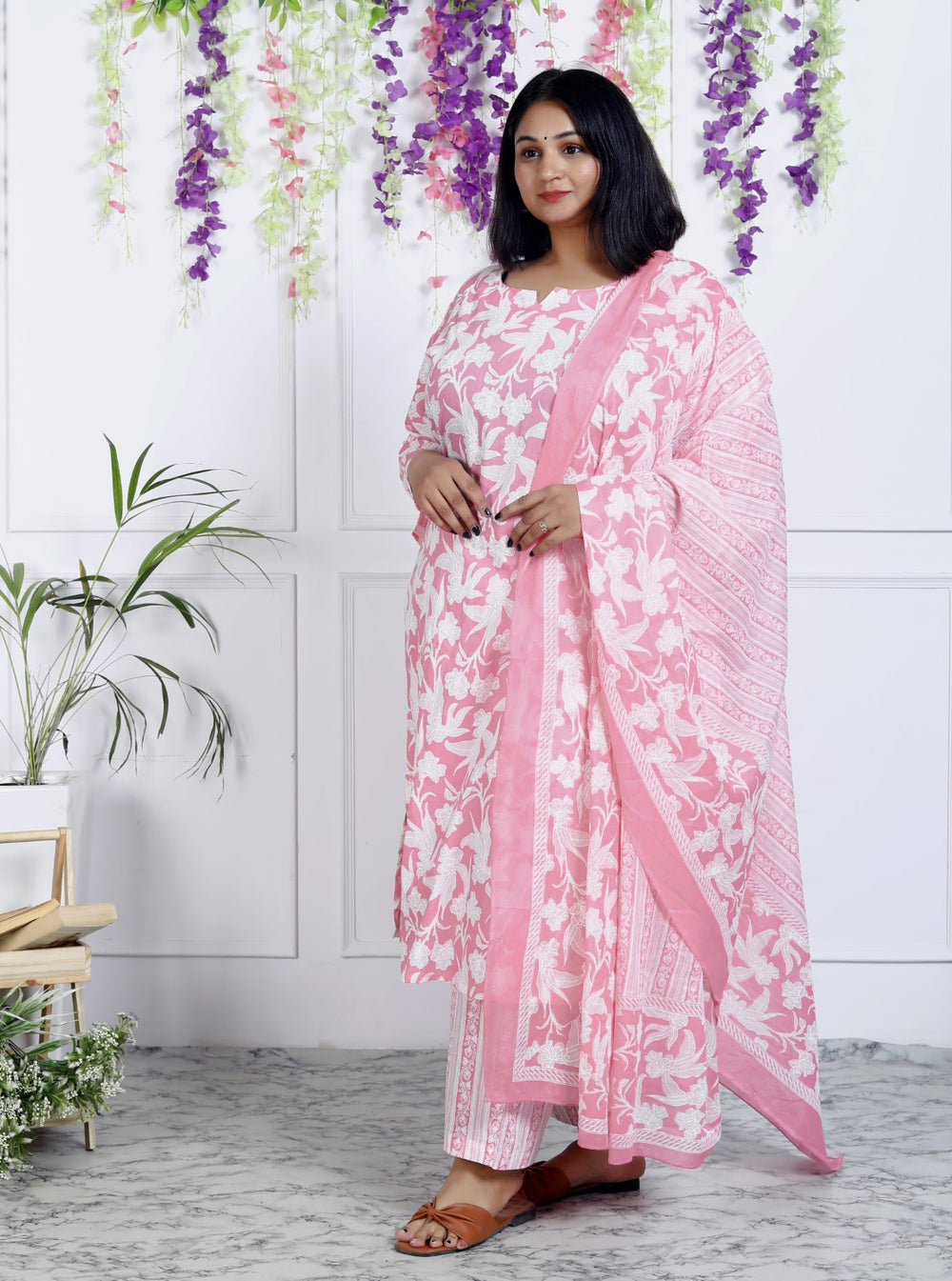 Embrace the perfect blend of style, comfort, and elegance with the Plus Size Pink Cotton Printed Kurta Pant Set with Dupatta!