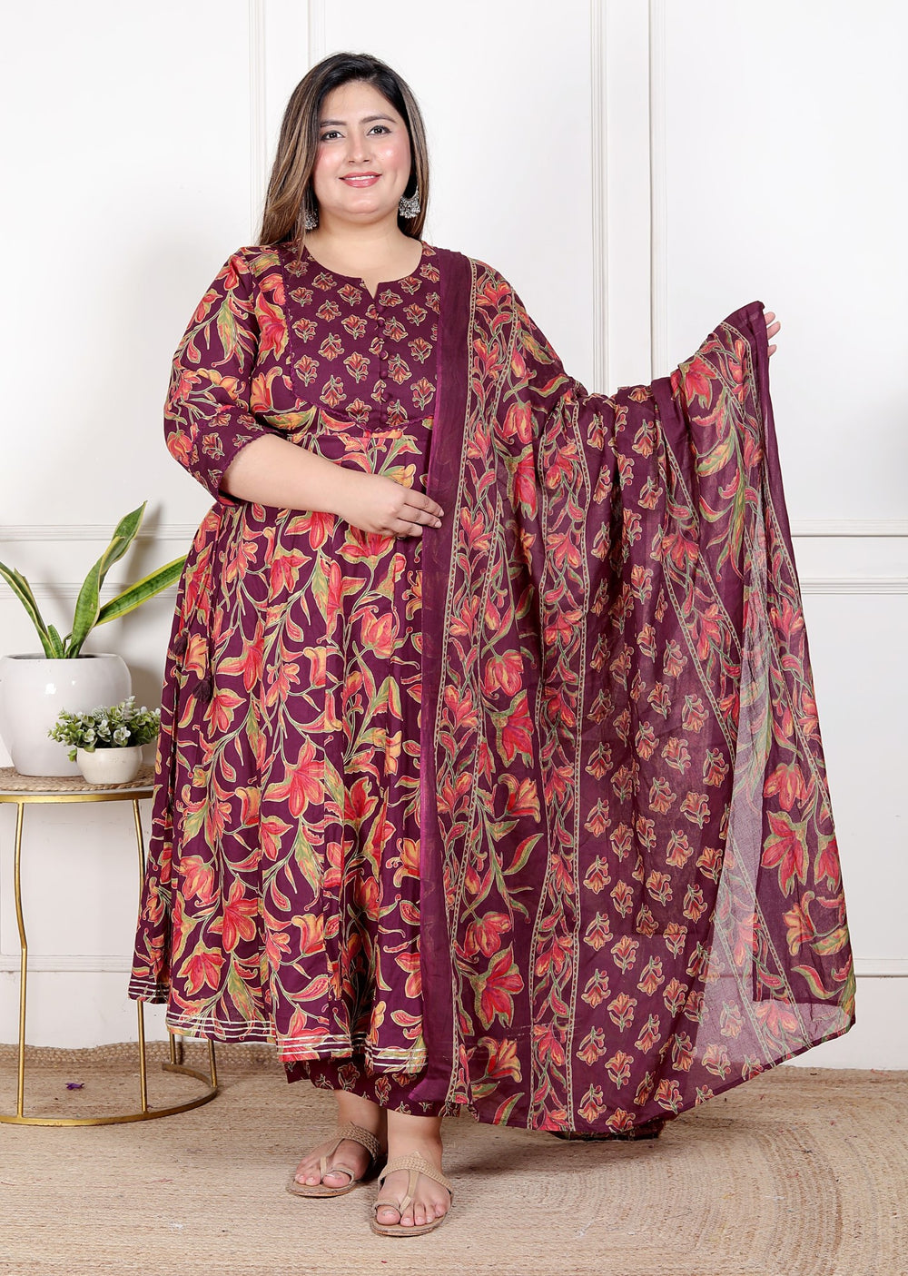 Add timeless elegance to your ethnic collection with the Plus Size Floral Print Pure Cotton Anarkali Flared Kurta Set with Dupatta. Designed for comfort and grace, this set blends traditional charm with a modern touch, making it ideal for festive, casual, and semi-formal occasions.