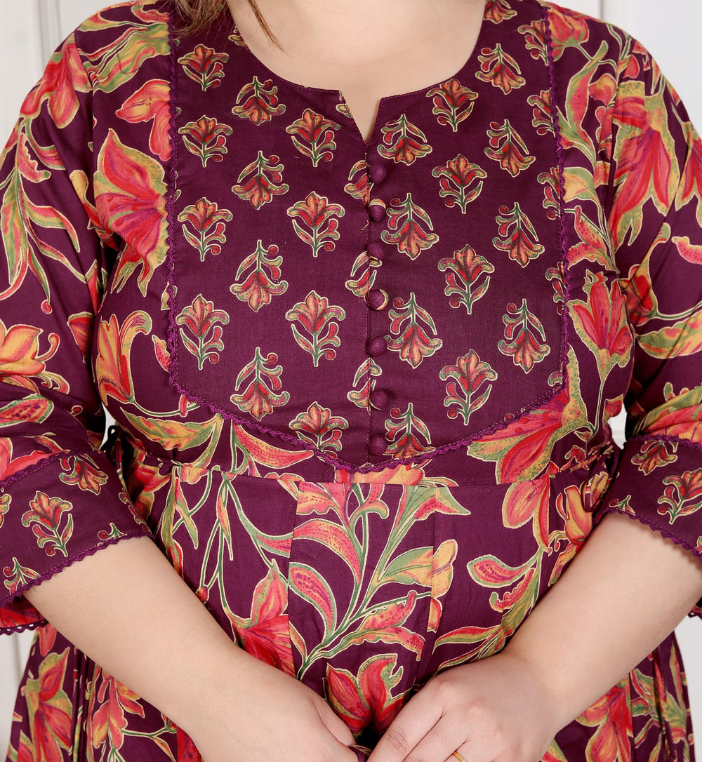 The Plus Size Floral Print Pure Cotton Anarkali Flared Kurta Set is made for women who value comfort without compromising on style. The breathable cotton ensures day-long ease, while the floral patterns bring out your graceful and feminine side. The flowing Anarkali cut flatters all body types, making it a must-have addition to your festive and everyday ethnic wardrobe.