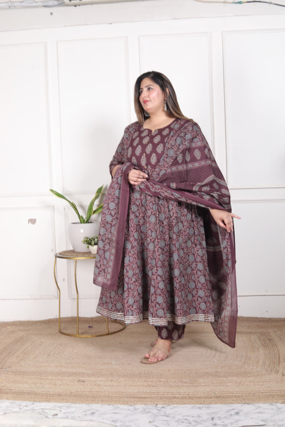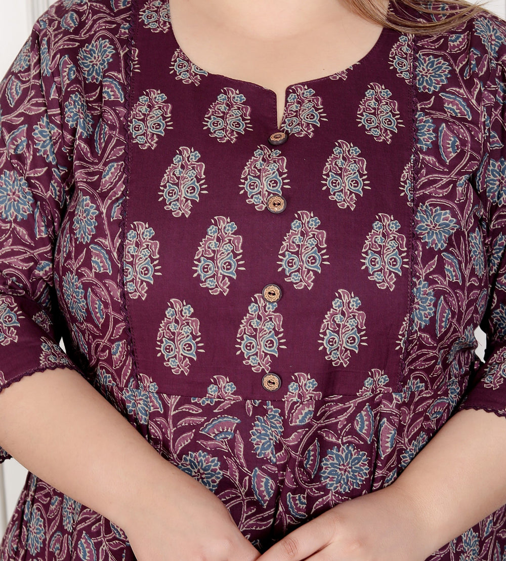 The Plus Size Floral Print Pure Cotton Anarkali Flared Kurta Set is made for women who value comfort without compromising on style. The breathable cotton ensures day-long ease, while the floral patterns bring out your graceful and feminine side. The flowing Anarkali cut flatters all body types, making it a must-have addition to your festive and everyday ethnic wardrobe.