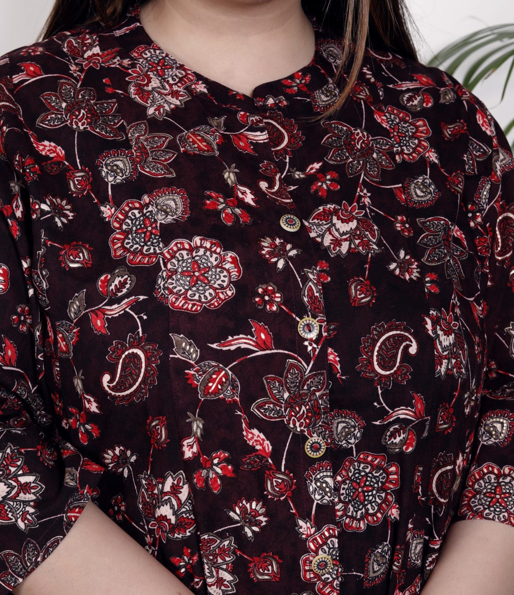 Featuring a Mandarin collar, front slits, and 3/4 sleeves, this Aline kurta is designed to flatter plus-sized frames while keeping you cool and chic. The pocket-free design ensures a sleek silhouette, making it a versatile piece for various occasions.