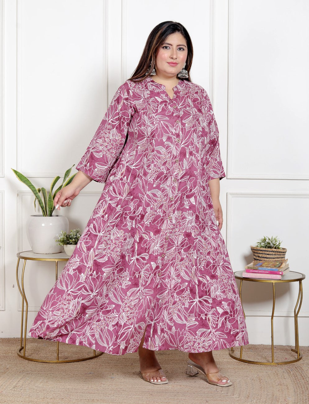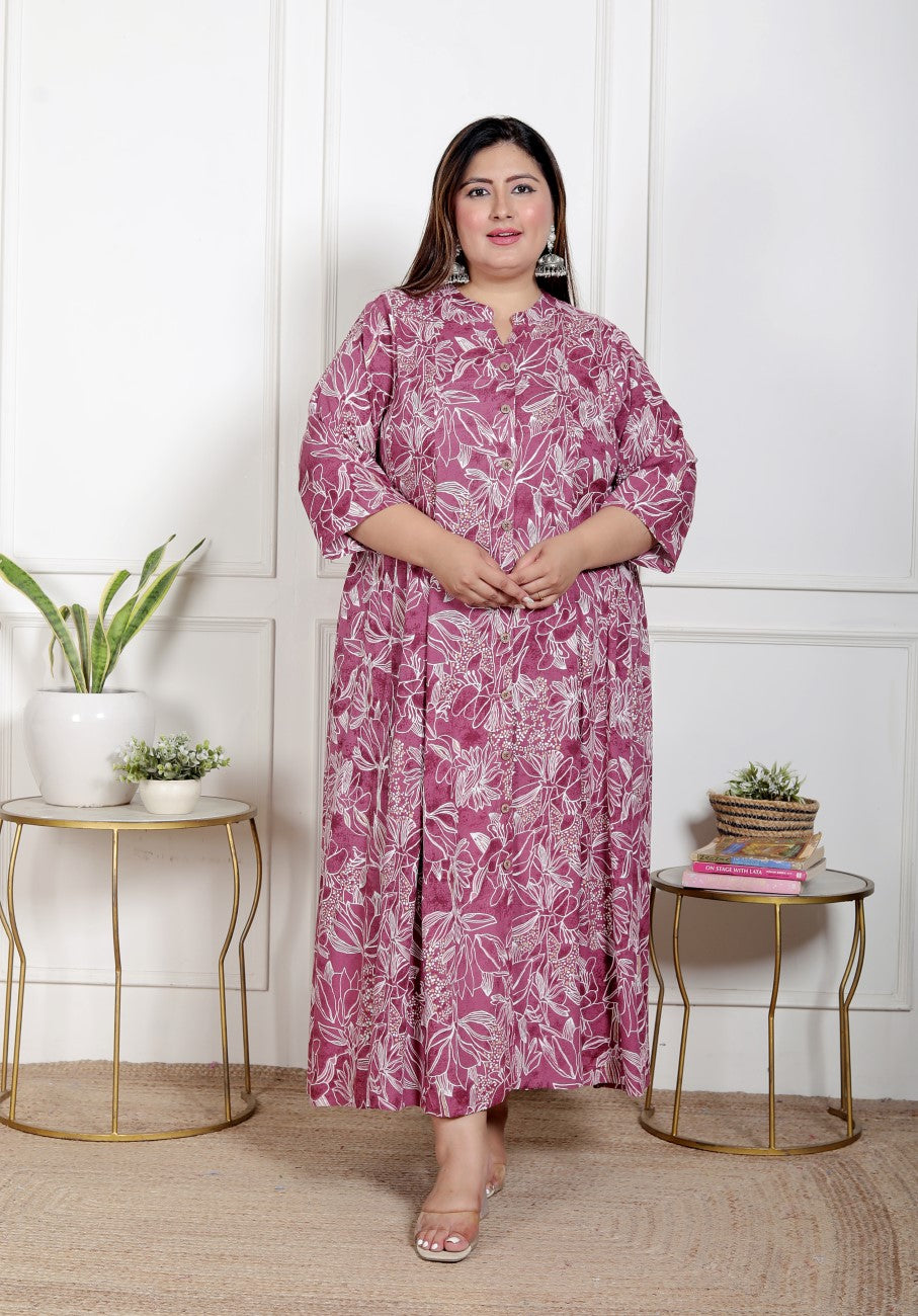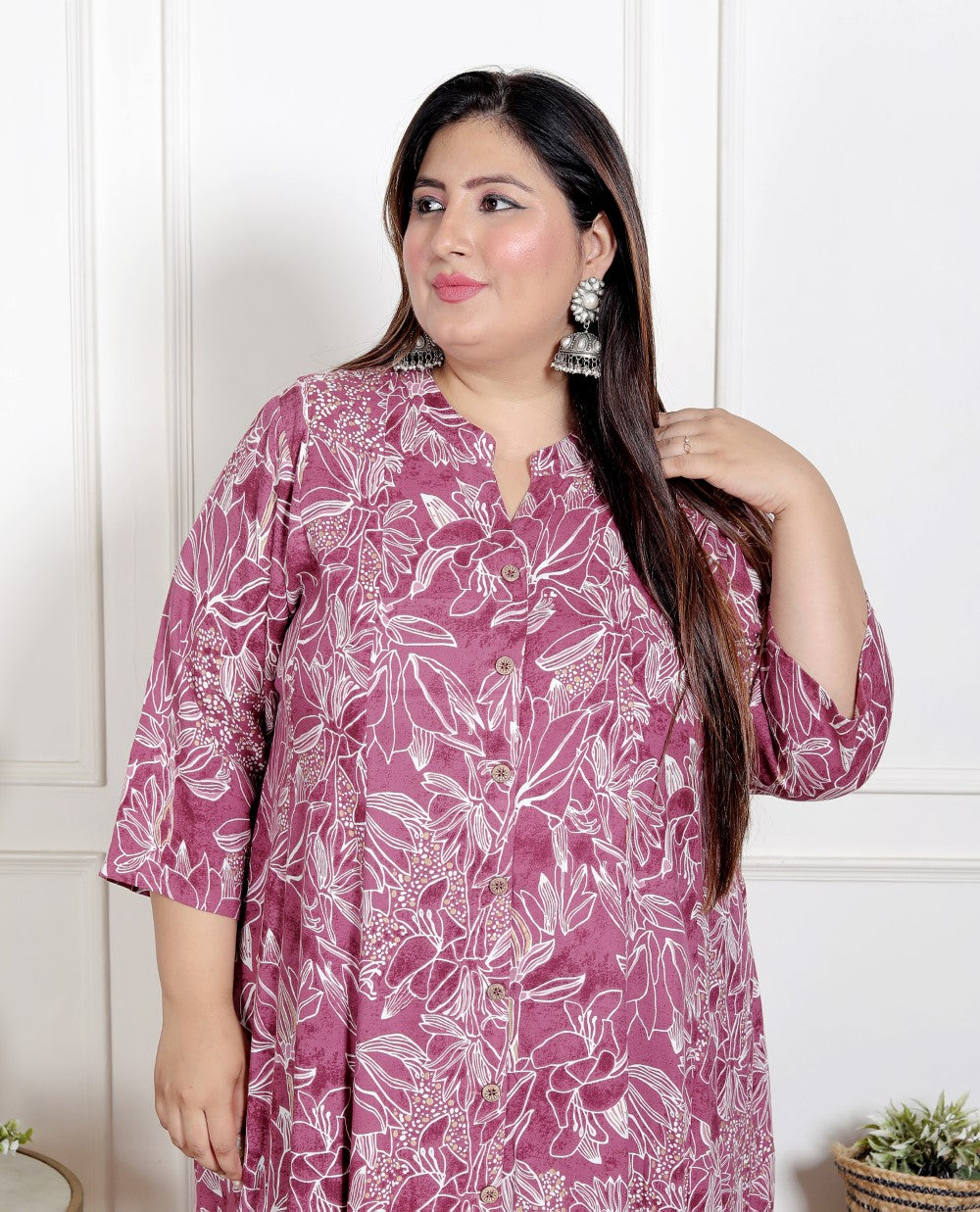 Add a pop of color to your wardrobe with the Plus Size Purple Cotton Blend Aline Kurta. This calf-length kurta in a rich Purple hue features a striking block print pattern, making it the perfect statement piece for any casual occasion. Crafted from a comfortable cotton blend fabric, this kurta ensures breathability and style. The V-neck design adds a touch of sophistication, while the 3/4 sleeves offer a graceful and versatile look. With convenient side slits and a sleek, pocket-free silhouette, this Aline kurta promises both comfort and elegance.