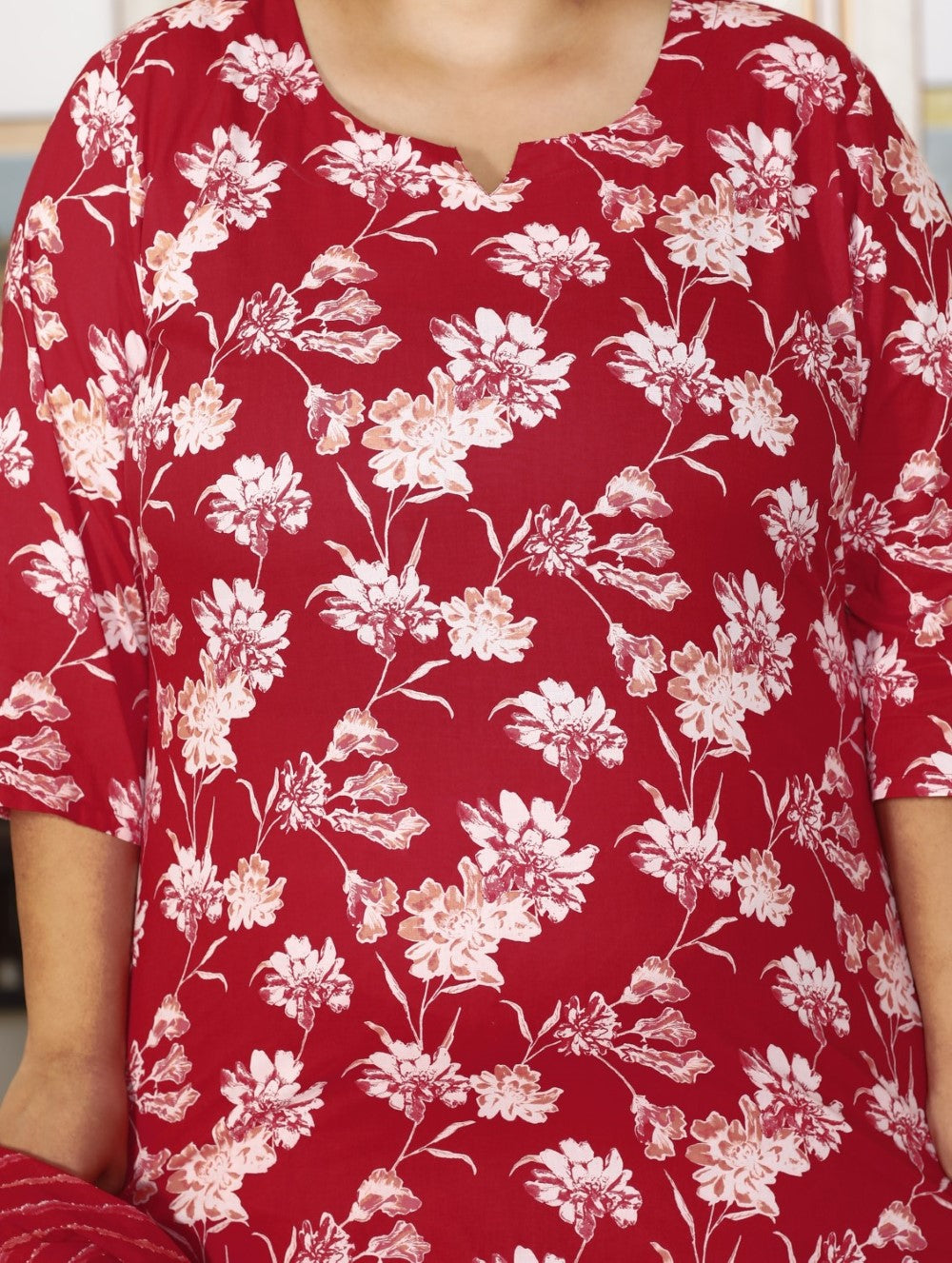 Enhance your look with this Plus Size Red Cotton Printed Kurta Pant Set With Dupatta, a versatile and stylish addition to your wardrobe. The red color adds sophistication, making it perfect for any occasion. This set has a flattering round neck, 3/4 sleeves, and a comfortable fit for all body types. The floral print pattern adds a feminine and trendy touch, ensuring you stand out. Made from breathable cotton fabric, it keeps you cool and comfortable all day. Upgrade your wardrobe with this elegant and fashionable set. With its Maroon color and trendy print, you can effortlessly make a statement wherever you go. Experience comfort and style with the Plus Size Red Cotton Printed Kurta Pant Set With Dupatta.