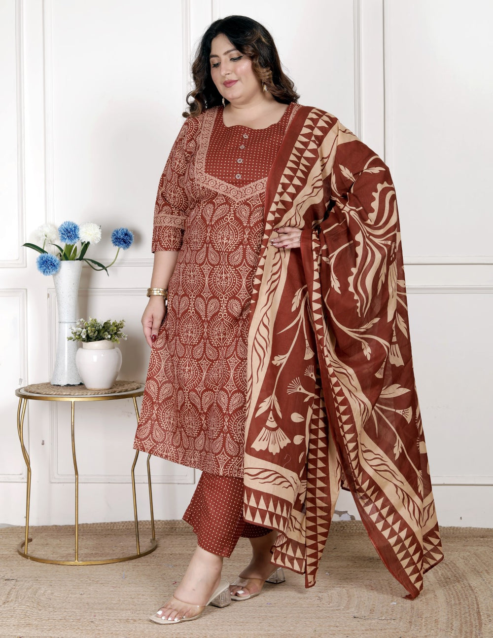 Plus Size Rust Cotton Printed Kurta Pant Set with Dupatta