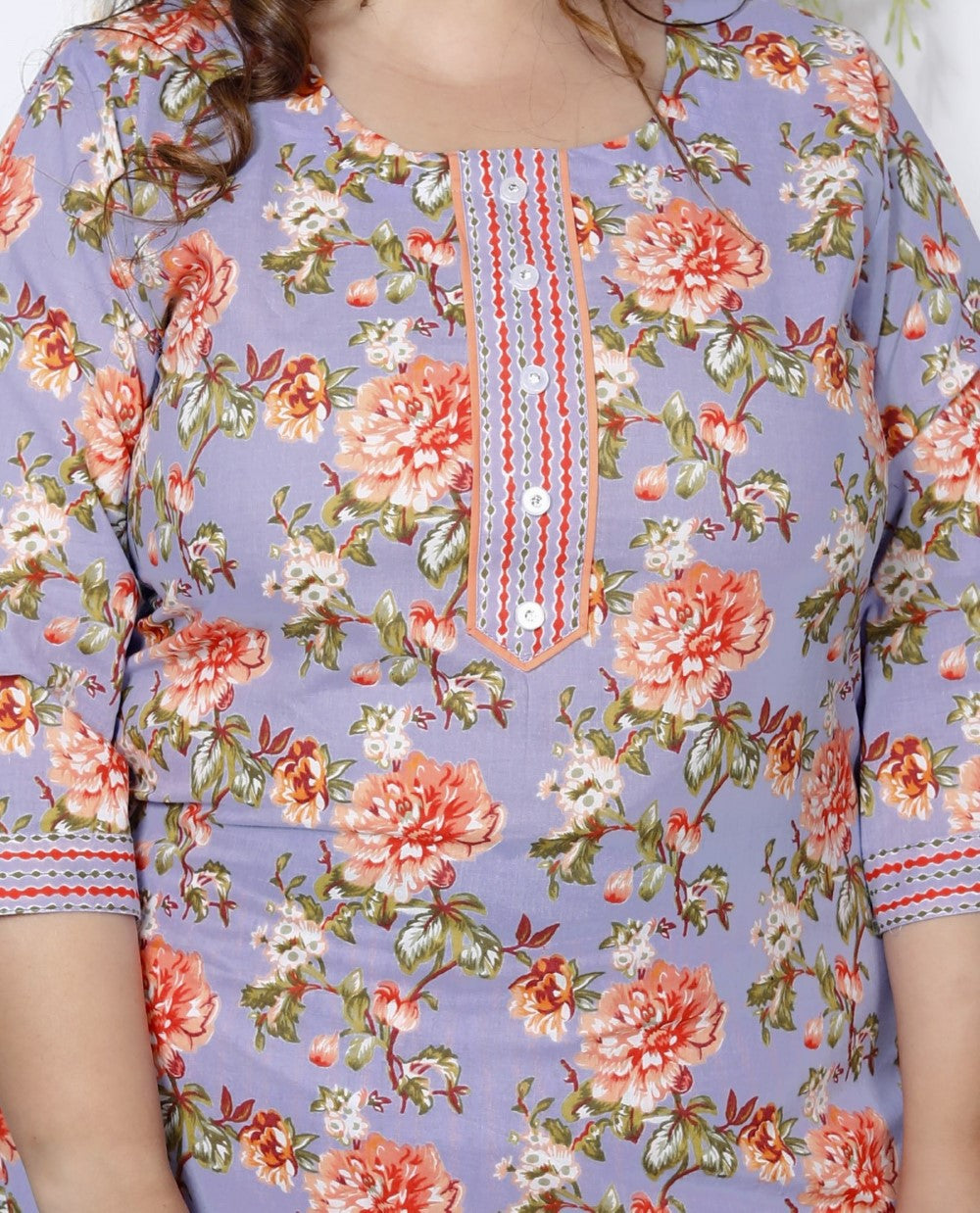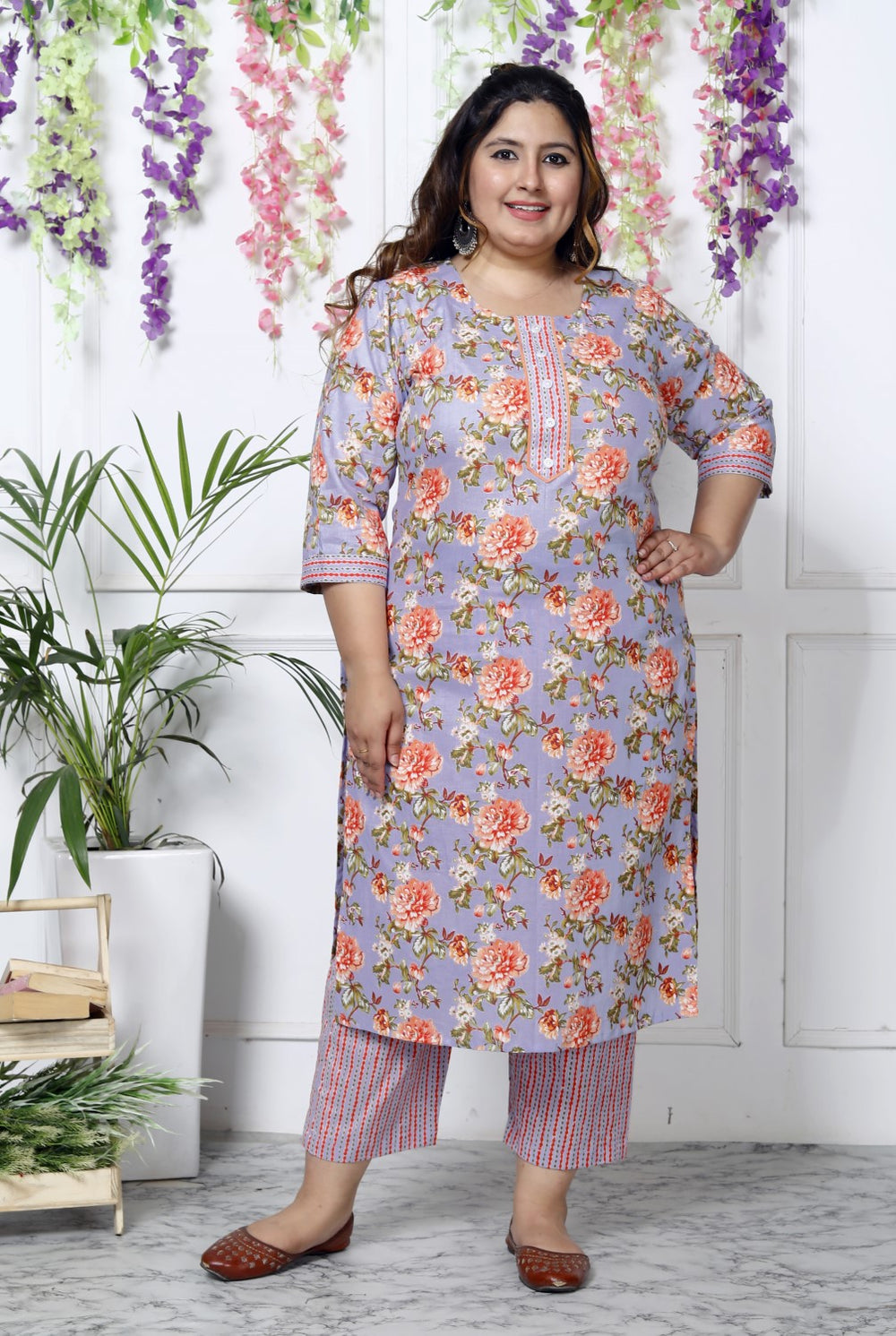 This Plus Size Sky Blue Cotton Printed Kurta Pant Set with Dupatta is designed to elevate your style while ensuring comfort. The beautiful floral print, classic round neck, and soft cotton fabric will keep you looking chic while staying comfortable. Whether it's a casual day out or a festive gathering, this set will make you feel stylish and confident.