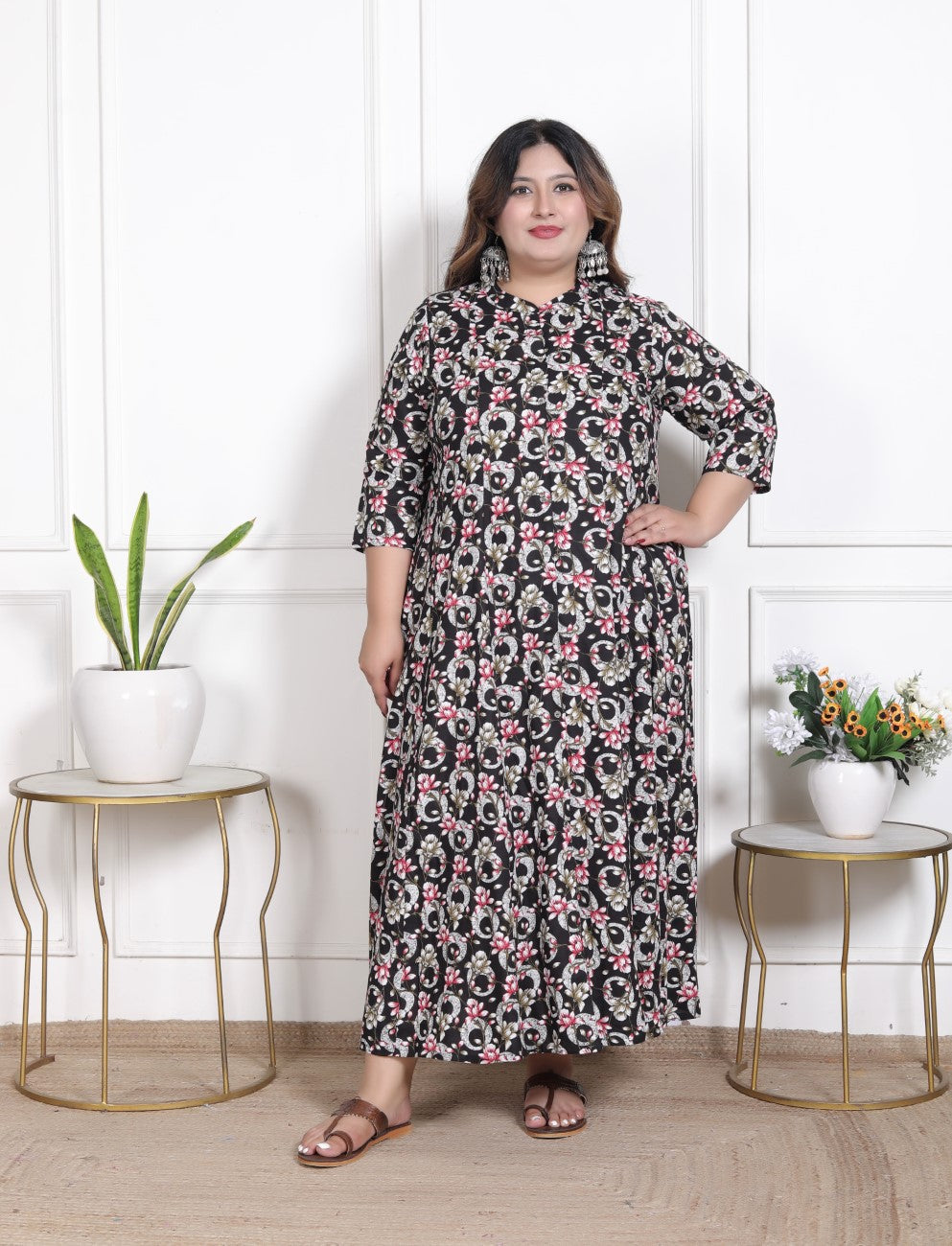 Unveil timeless beauty with the Plus Size Black Floral Print Anarkali from Swasti Clothing. This stunning gown is crafted from premium cotton blend fabric, offering both comfort and style for your casual and festive occasions. The mandarin neck adds an elegant touch, complementing the graceful, flowing silhouette of this classic anarkali design.
