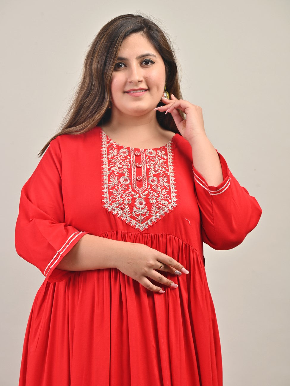 Make a bold statement with our Plus Size Red Cotton Blend Embroidered Anarkali. This ankle-length gown is the perfect combination of traditional elegance and modern style, designed to suit any occasion, from festive celebrations to casual outings.
