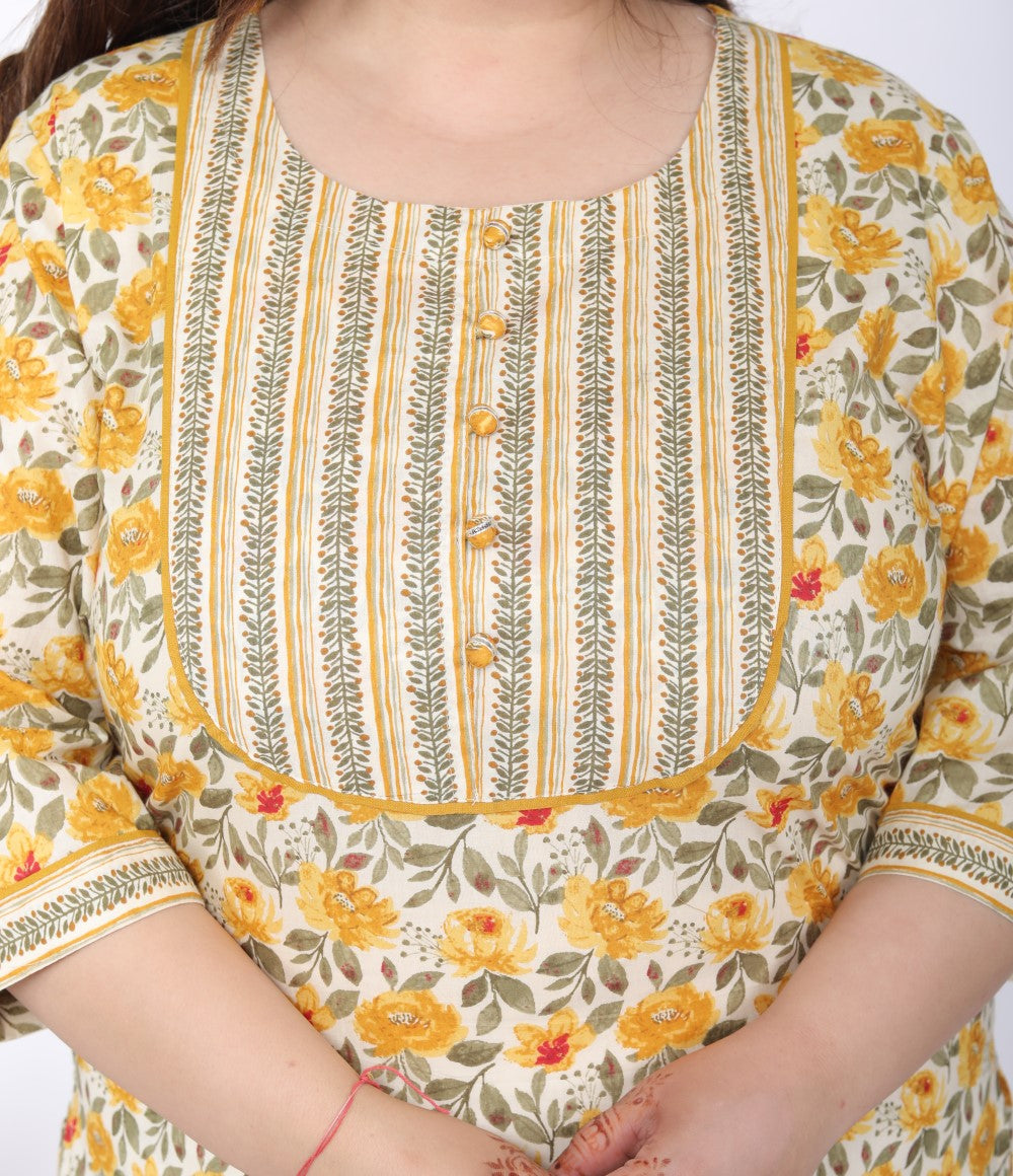 Plus Size Yellow Cotton Floral Print Straight Kurta