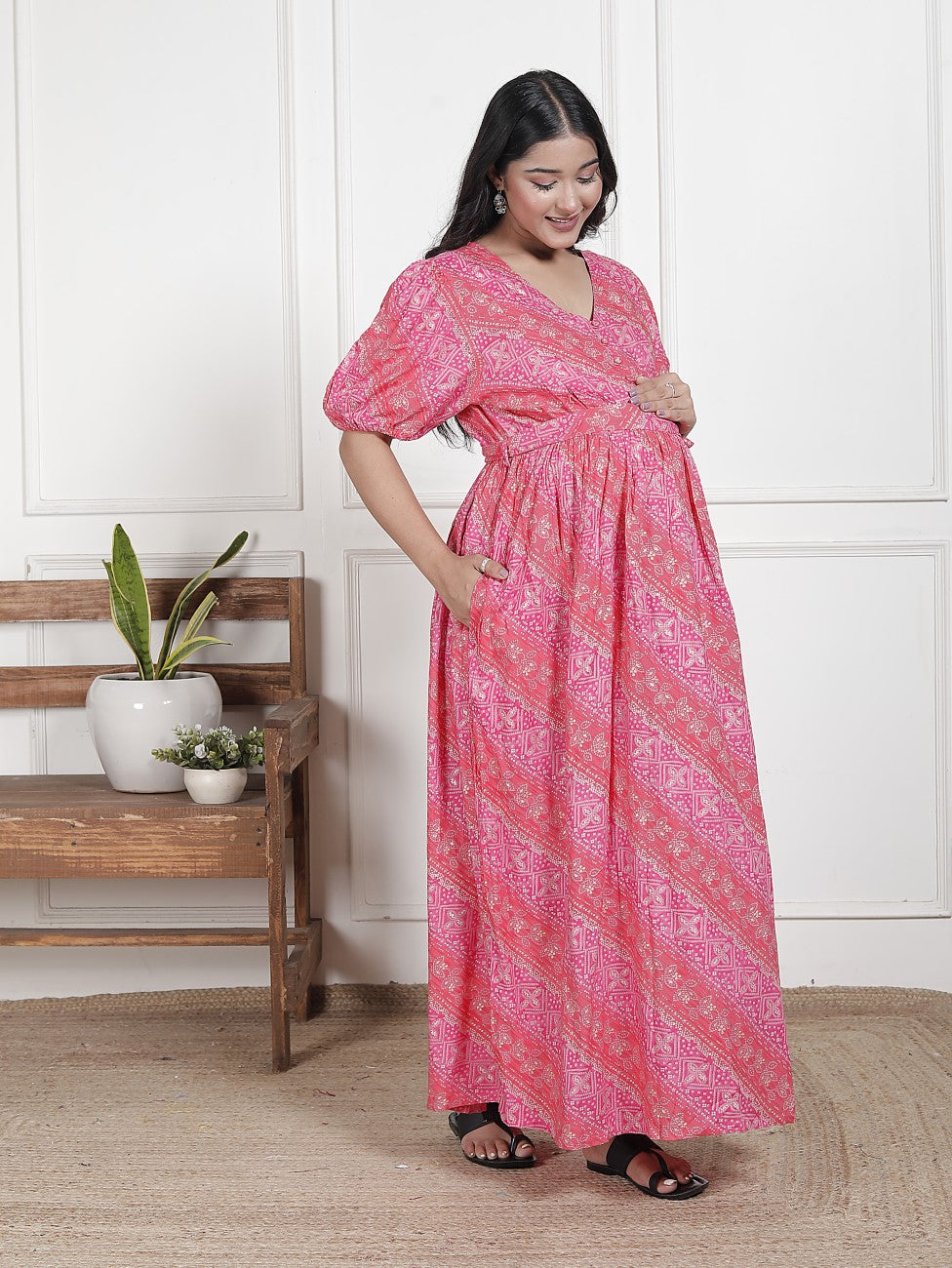 Embrace your maternity glow with the Pink Floral Print Flared Maternity Gown. Designed for elegance and comfort, this gown is crafted from breathable cotton blend fabric, ensuring comfort throughout the day. Whether for a baby shower, a festive event, or casual wear, this gown combines chic style with practicality.