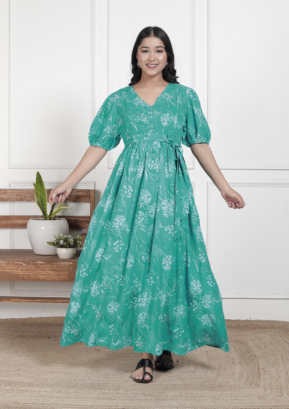 Embrace your maternity glow with the Turquoise Floral Print Flared Maternity Gown. Designed for elegance and comfort, this gown is crafted from breathable cotton blend fabric, ensuring comfort throughout the day. Whether for a baby shower, a festive event, or casual wear, this gown combines chic style with practicality.